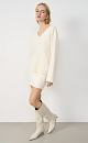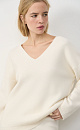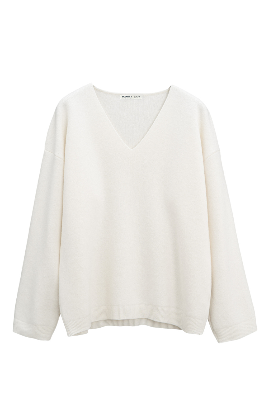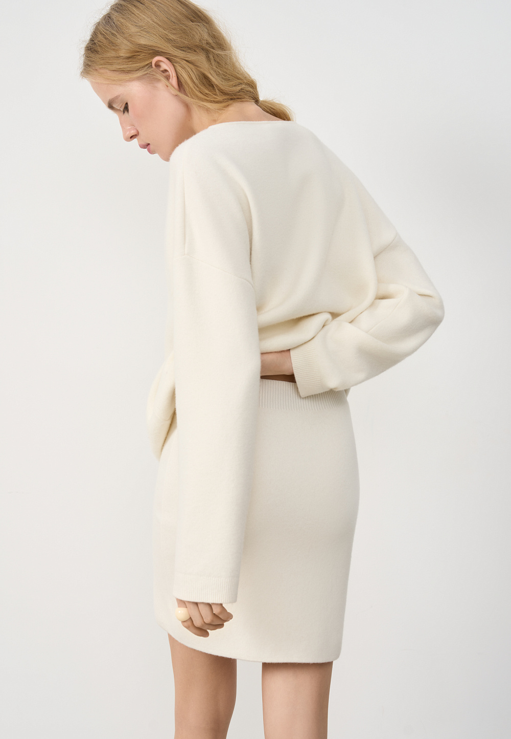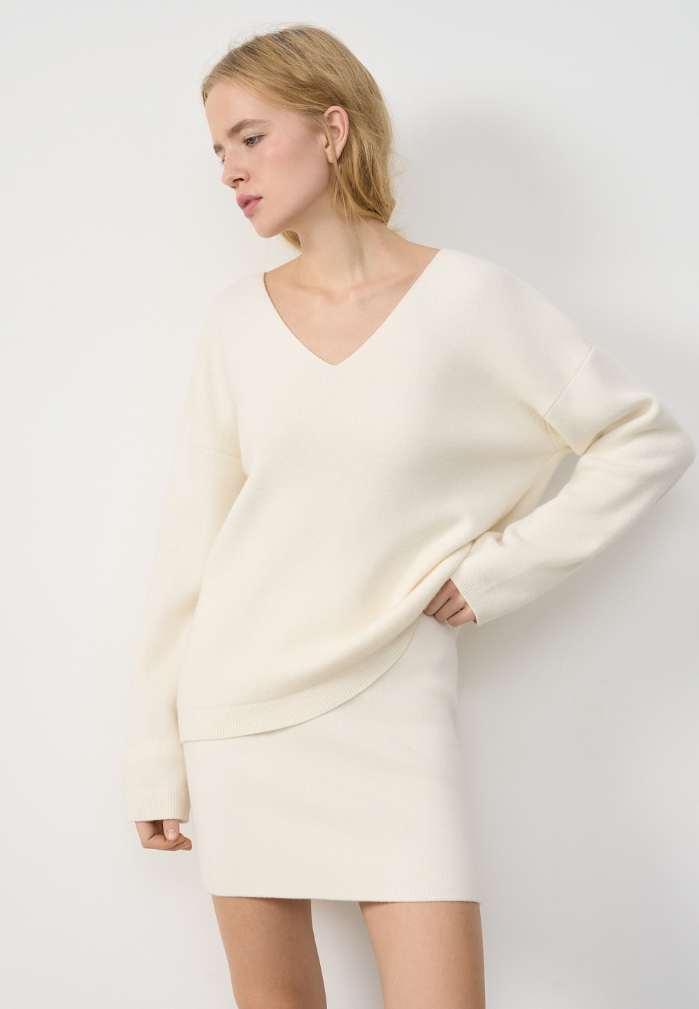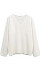 Knitted jumper made of wool with the addition of cashmere. The model has a loose silhouette with dropped shoulders and a V-shaped neckline. The sleeve cuffs and hem are ribbed.