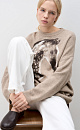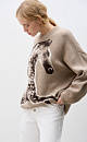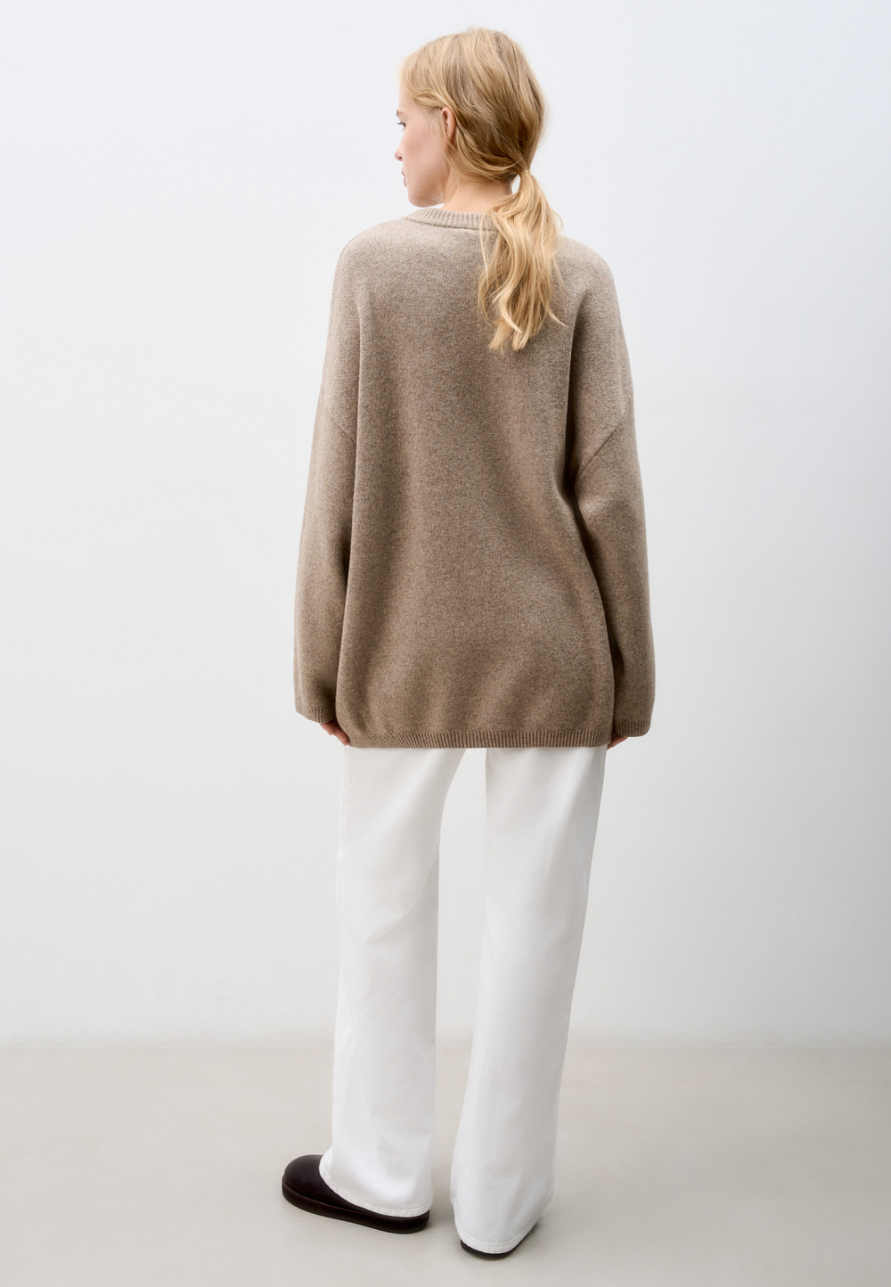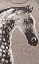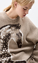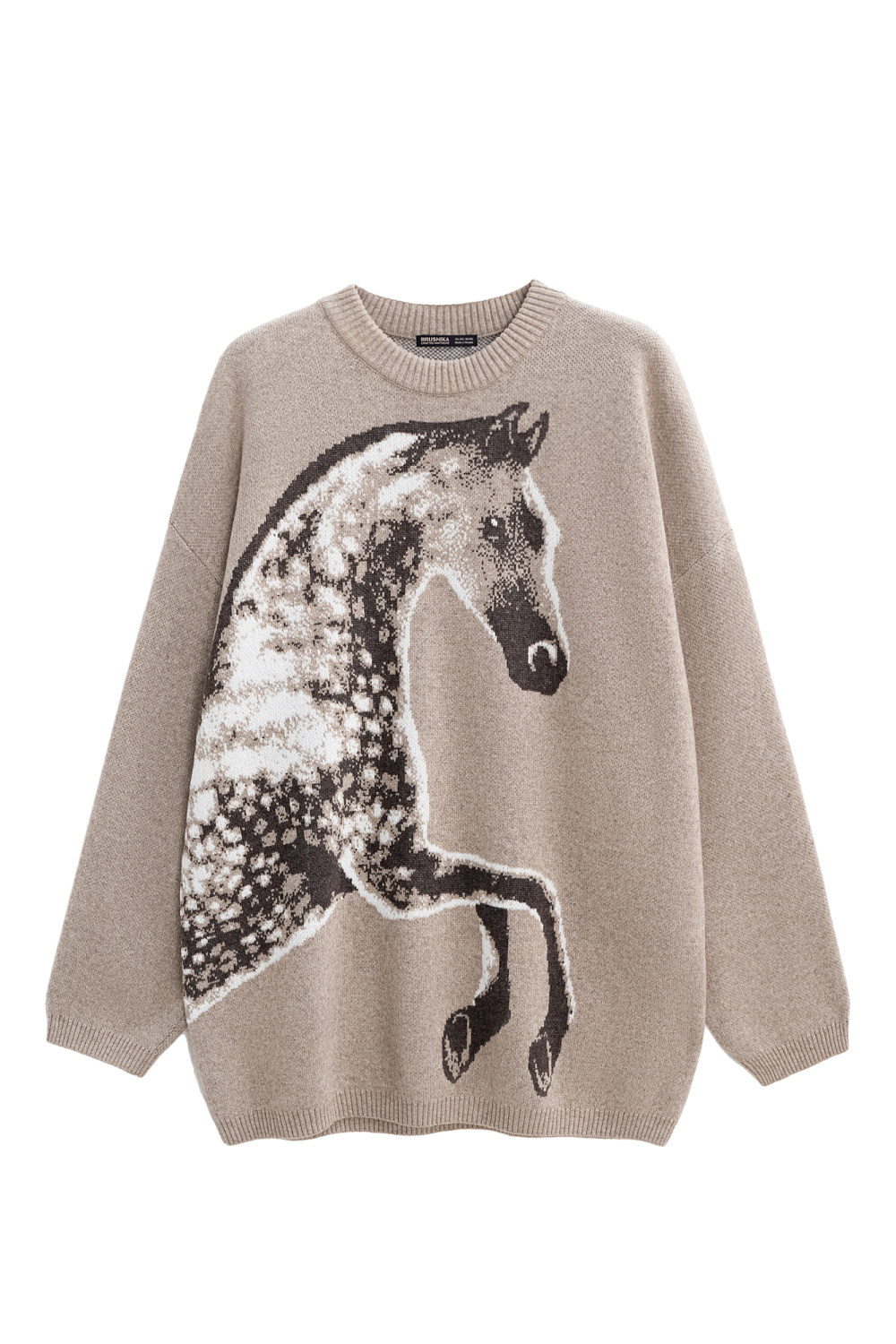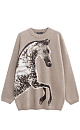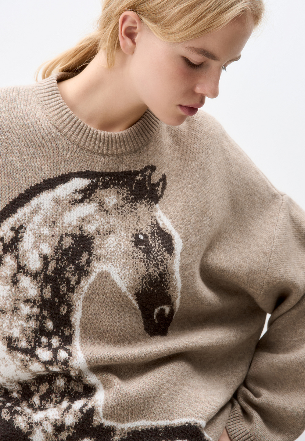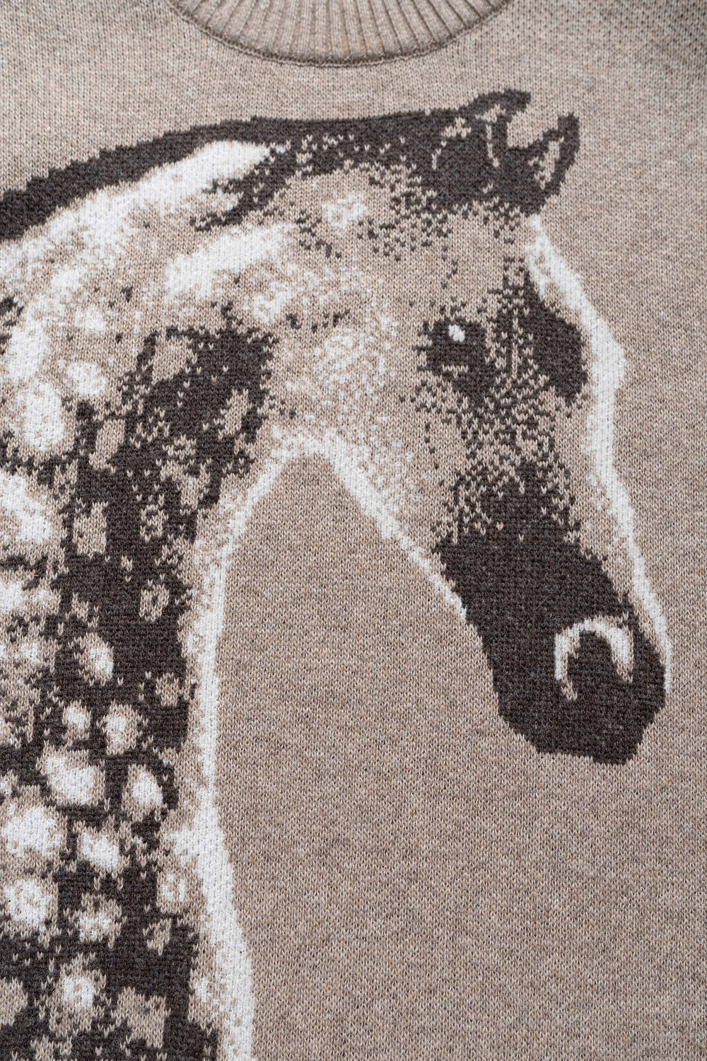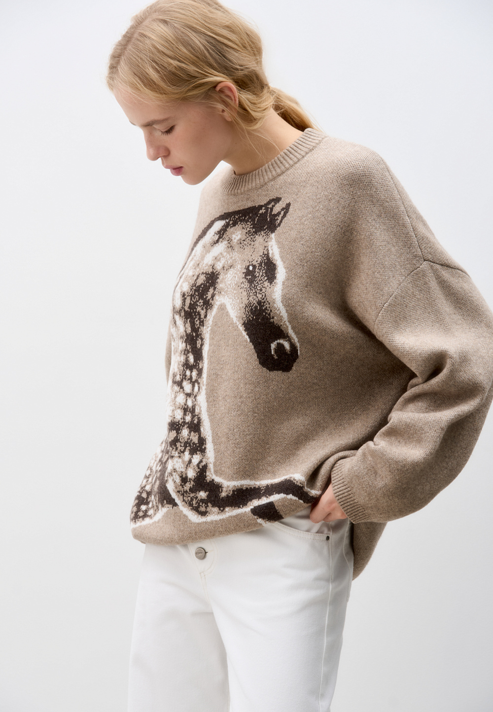 Knitted jumper made of wool and cashmere. Loose silhouette with dropped shoulders, round neckline and jacquard animal print of a horse. The edges of the product are ribbed.