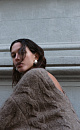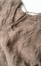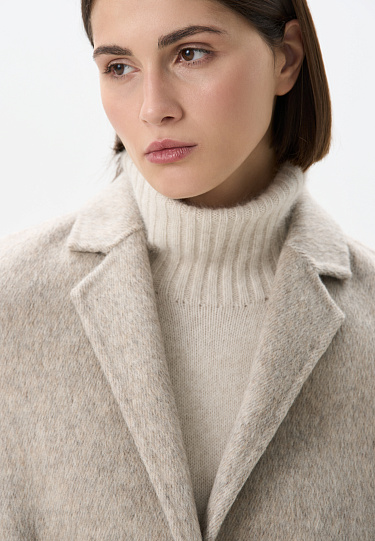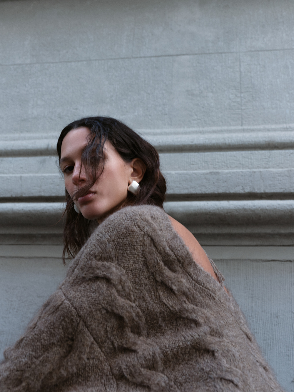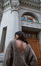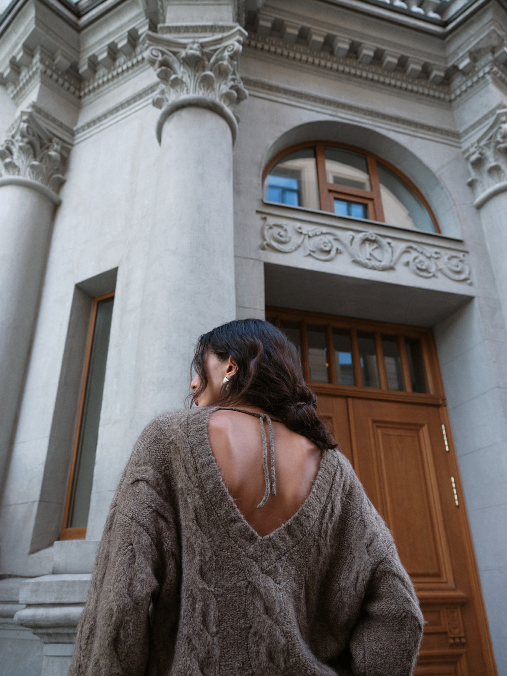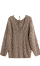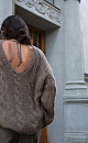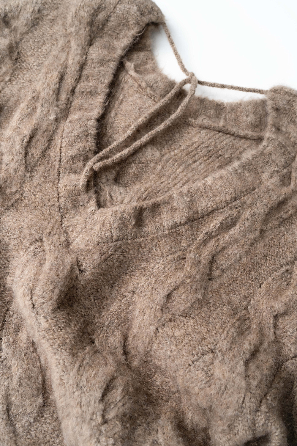 Knitted jumper made of wool and mohair. The model has a loose silhouette with dropped shoulders, long sleeves, a round neckline and a deep cutout at the back, secured with a drawstring. The product is decorated with textured knitting in the form of braids. The edges of the product are ribbed.