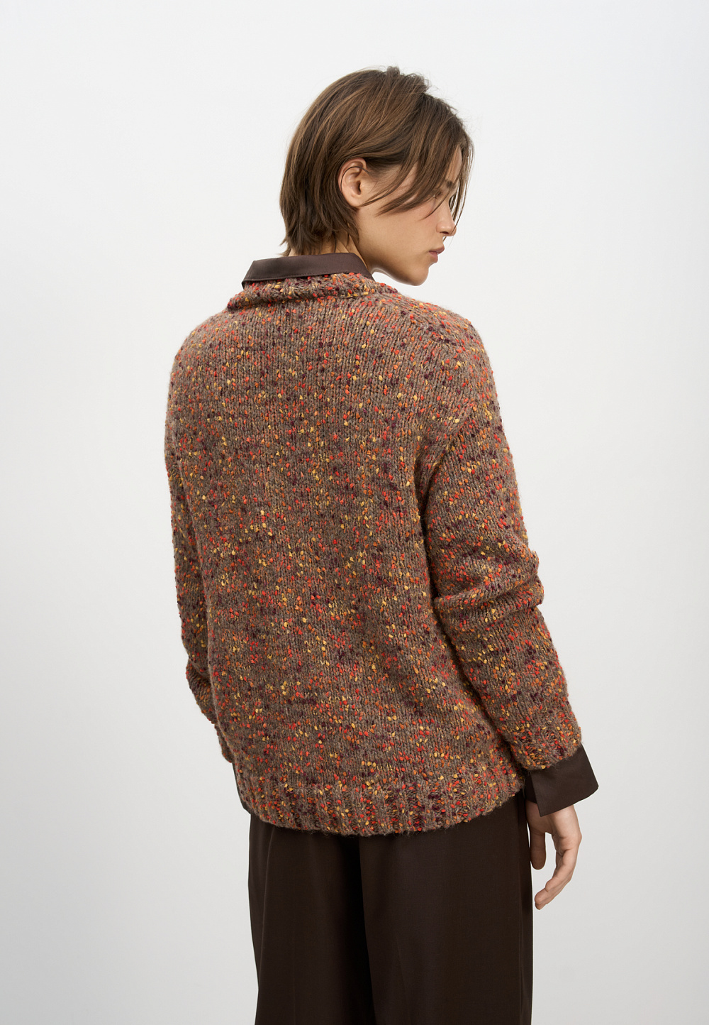 Bouclé alpaca wool jumper. Model of a loose silhouette with epaulette sleeves and a round collar. The bottom of the product, sleeve cuffs and collar are made with a wide rib.