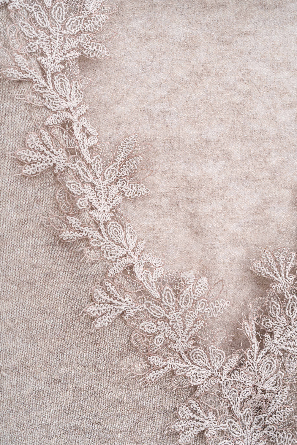 Knitted translucent jumper made of extrafine merino wool and extrafine alpaca. The model has a loose silhouette with dropped shoulders and a V-shaped neckline on the back, decorated with lace.
