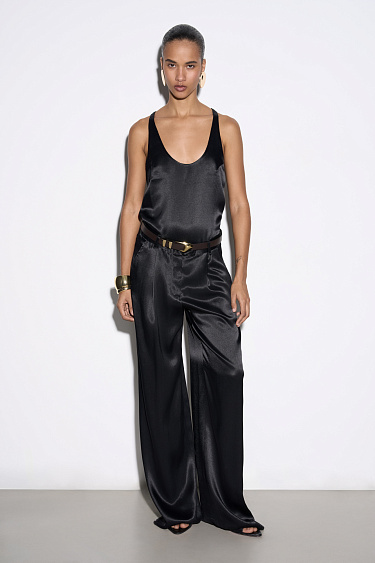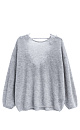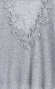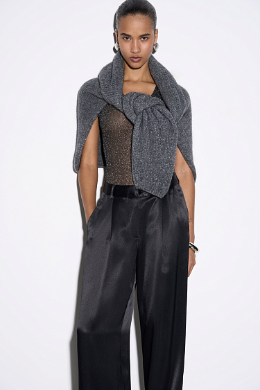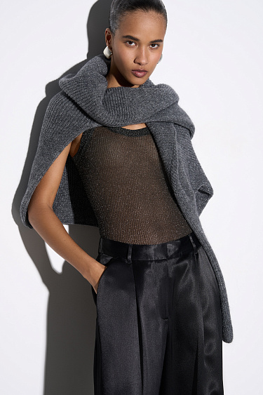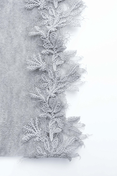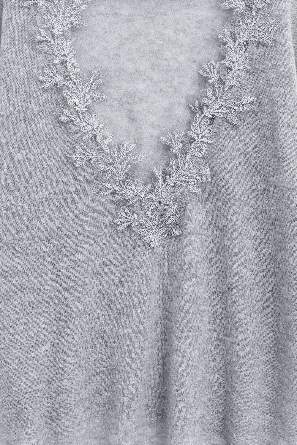 Knitted translucent jumper made of extrafine merino wool and extrafine alpaca. The model has a loose silhouette with dropped shoulders and a V-shaped neckline on the back, decorated with lace.