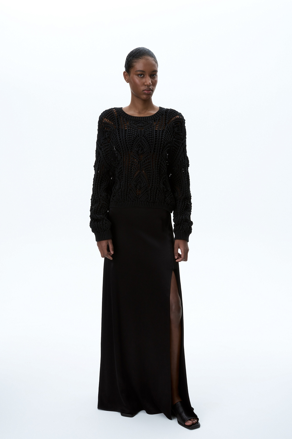 Openwork knit cotton jumper with long sleeves. Ribbed cuffs and hem.