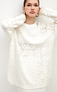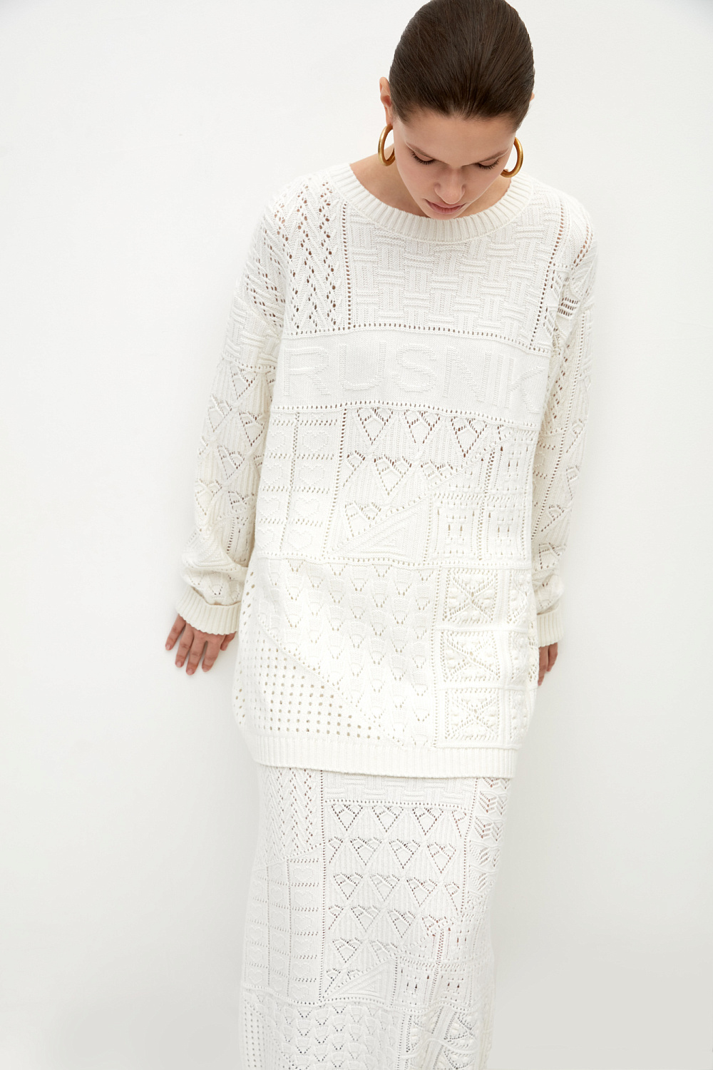 Wool blend knit jumper. Loose-fit silhouette with a dropped shoulders and an openwork weave. Pairing with a matching skirt and shorts.