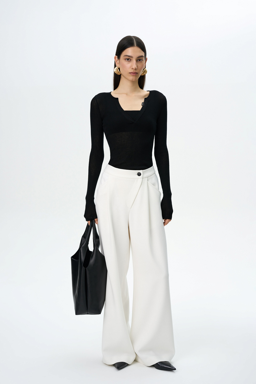 Fitted knit top with cut-out. Features long sleeves and logo placket.