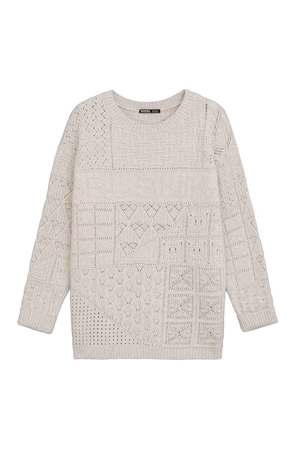 Wool blend knit jumper. Loose-fit silhouette with a dropped shoulders and an openwork weave. Pairing with a matching skirt and shorts.