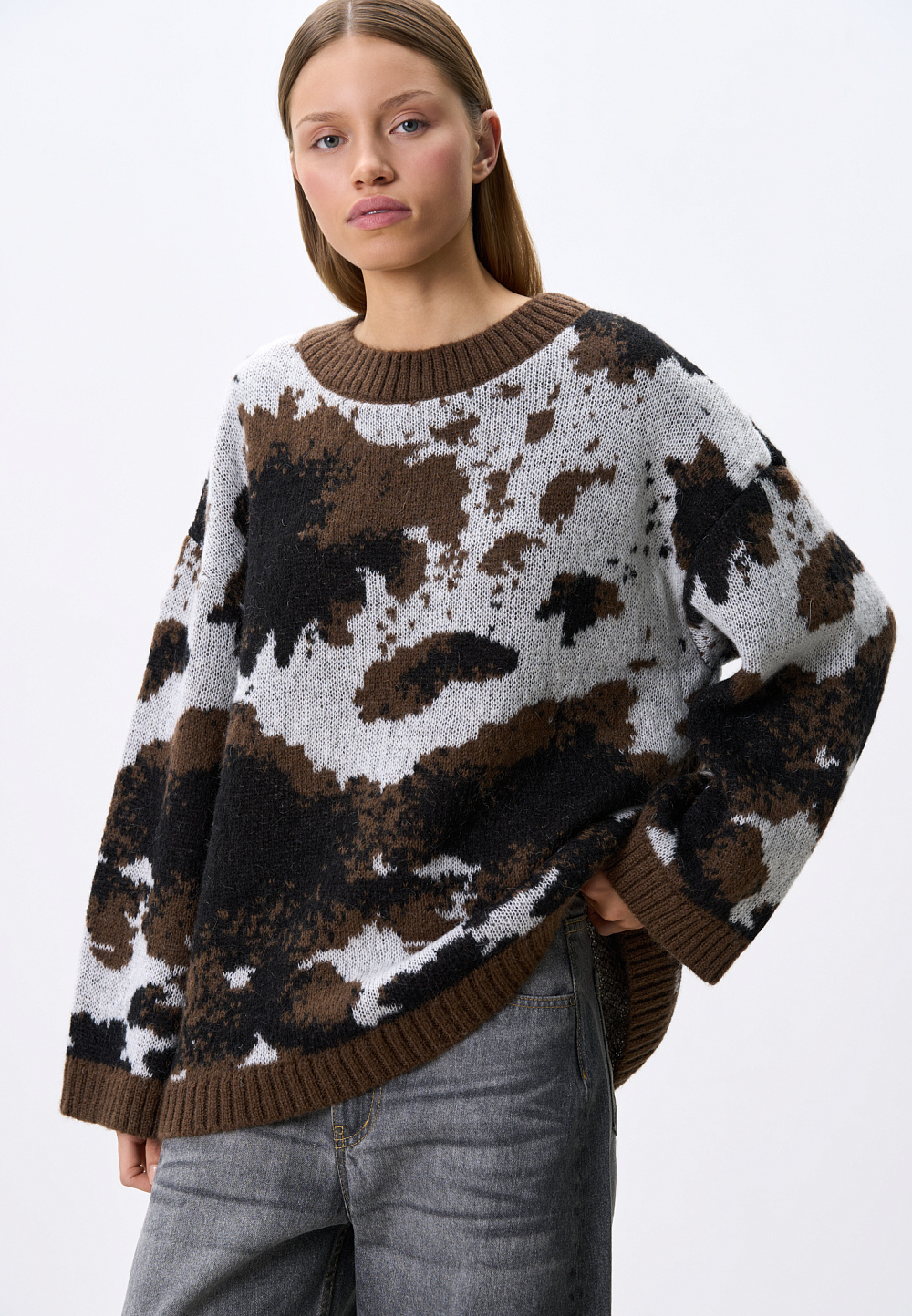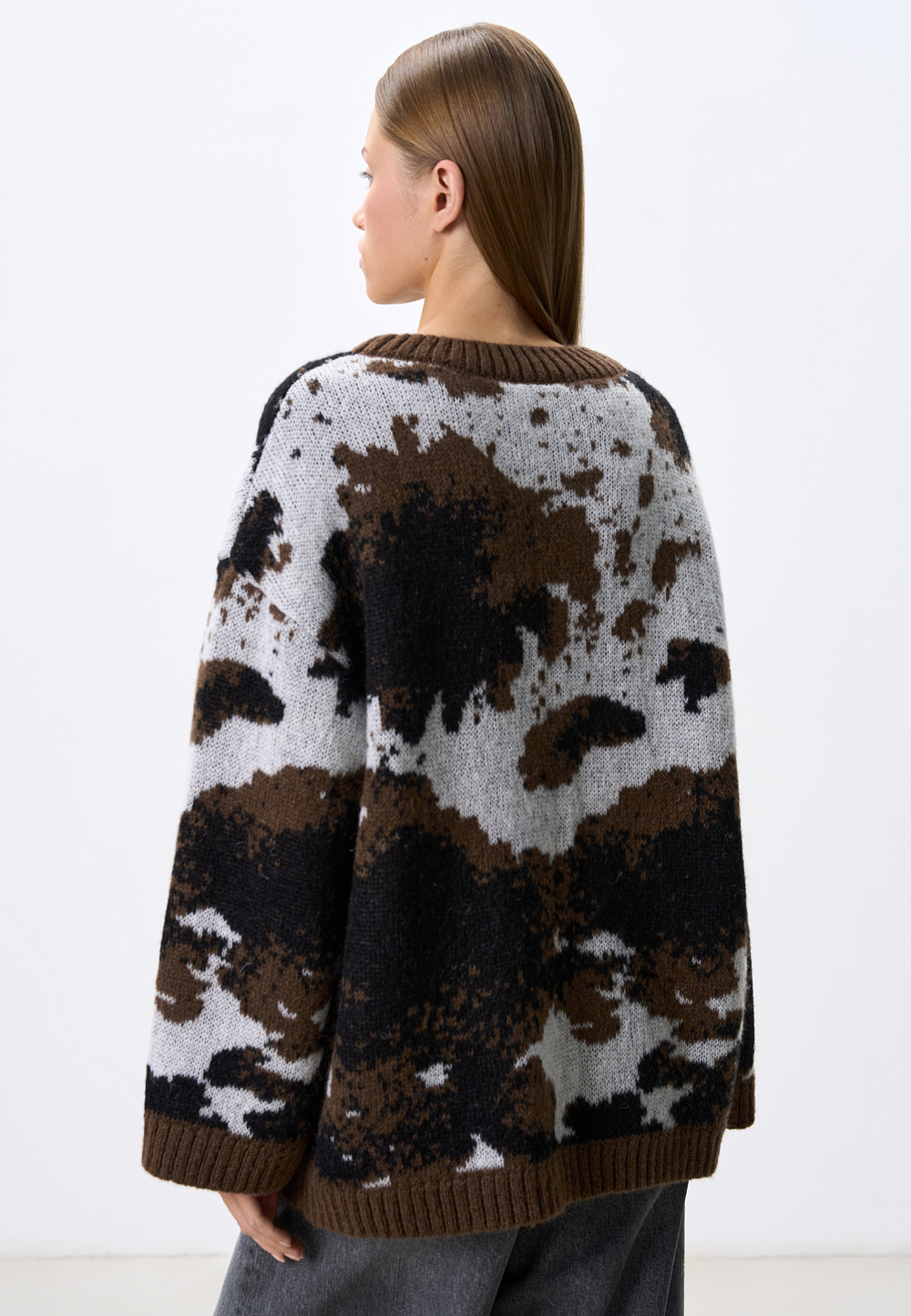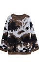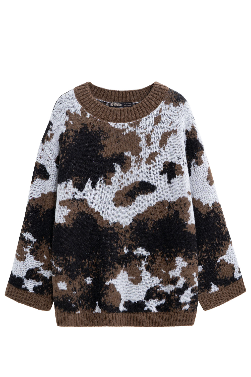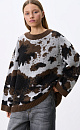 Knitted jumper with jacquard animal design in wool and mohair. Model of a loose silhouette with a dropped shoulder line, with a round neckline. The edges of the product are ribbed.