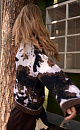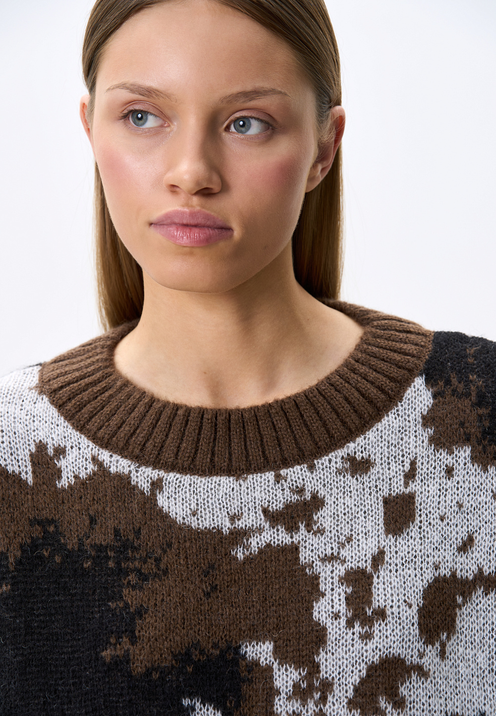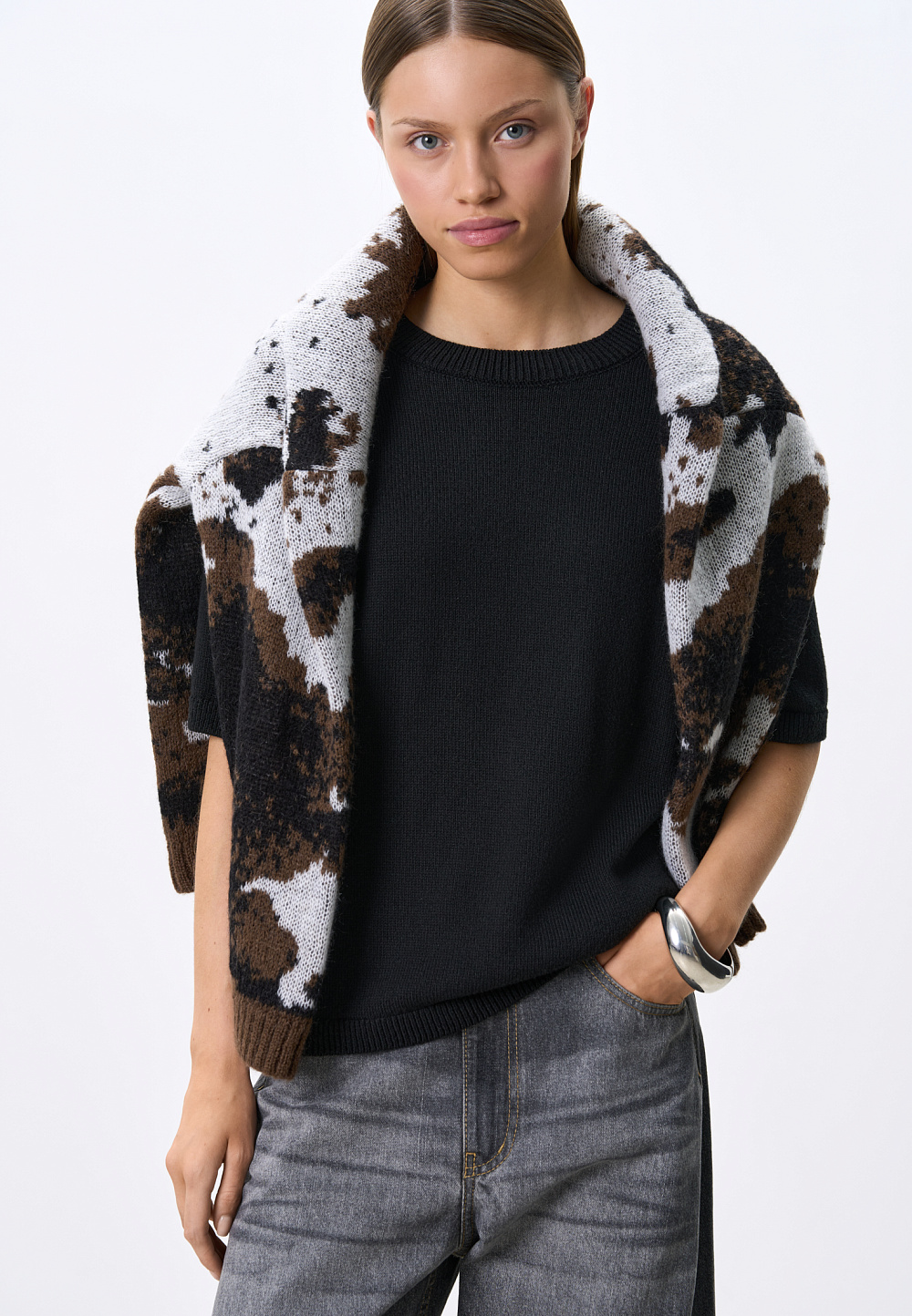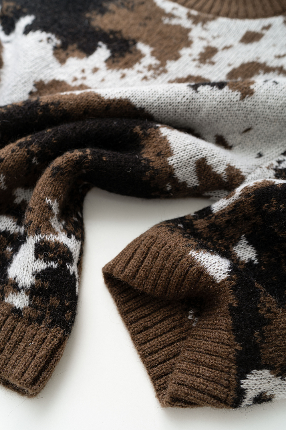 Knitted jumper with jacquard animal design in wool and mohair. Model of a loose silhouette with a dropped shoulder line, with a round neckline. The edges of the product are ribbed.