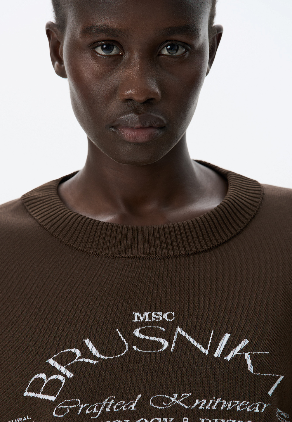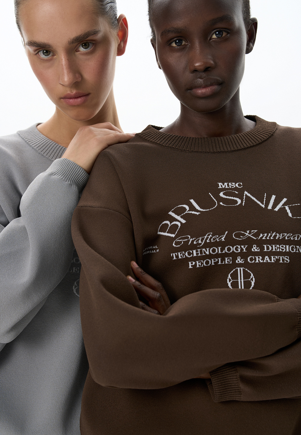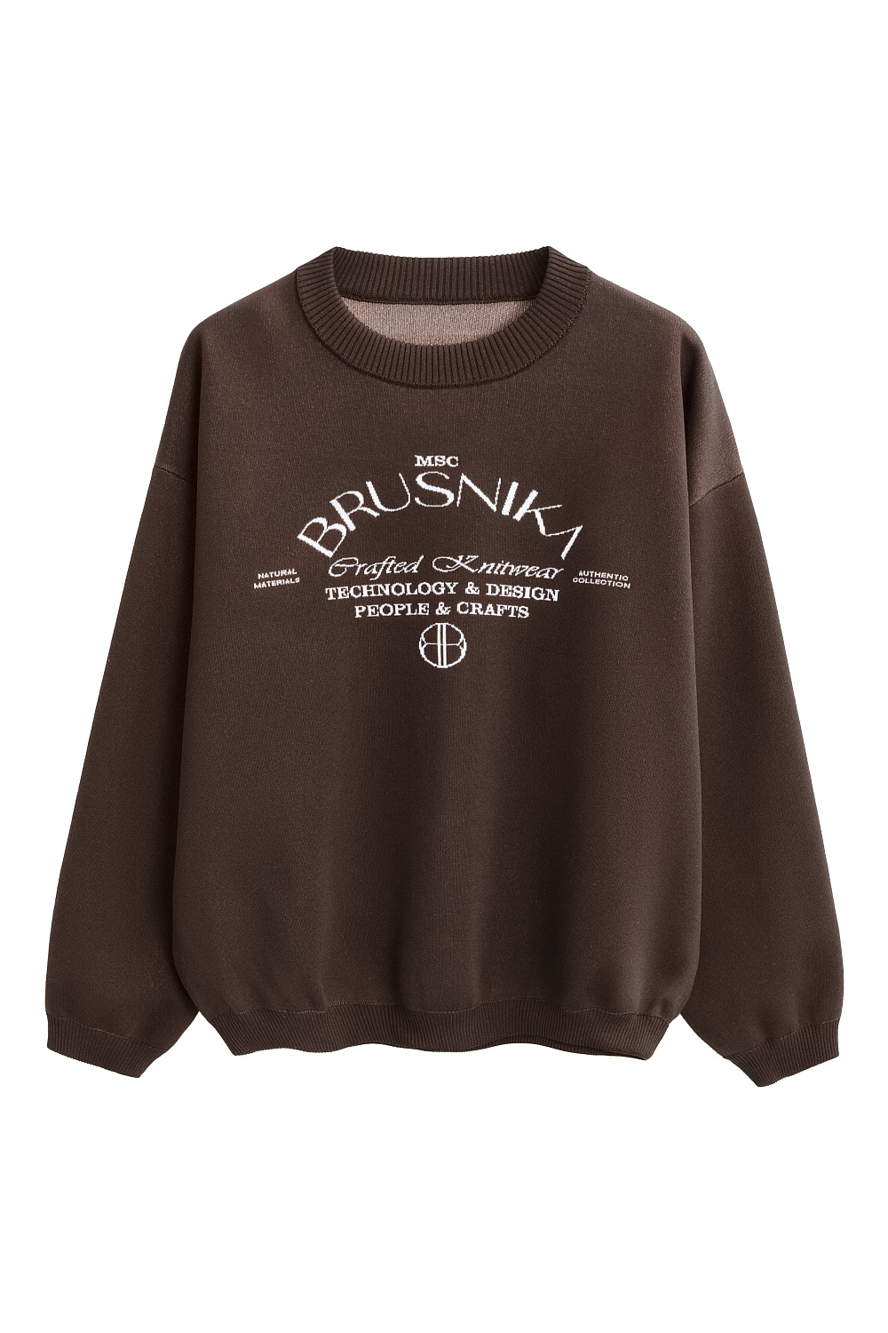 Knitted viscose jumper. Loose silhouette model with long sleeves, dropped shoulders and a round neckline. The edges are ribbed. The product is decorated with branded jacquard.