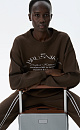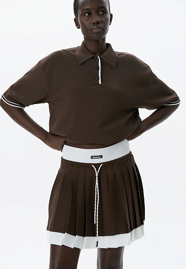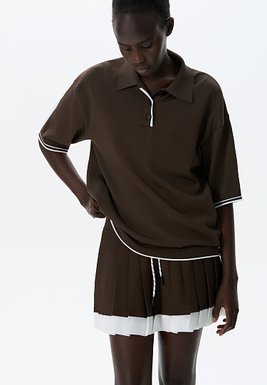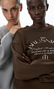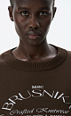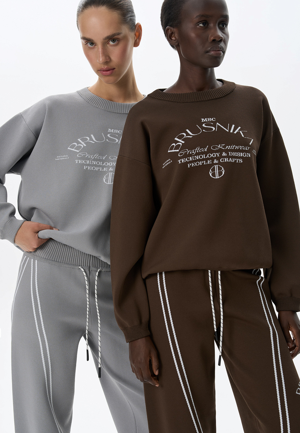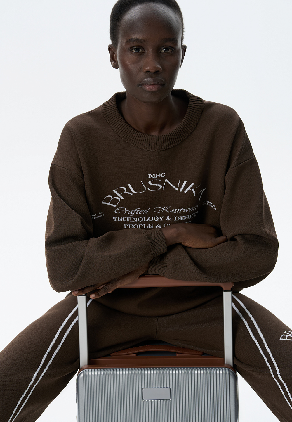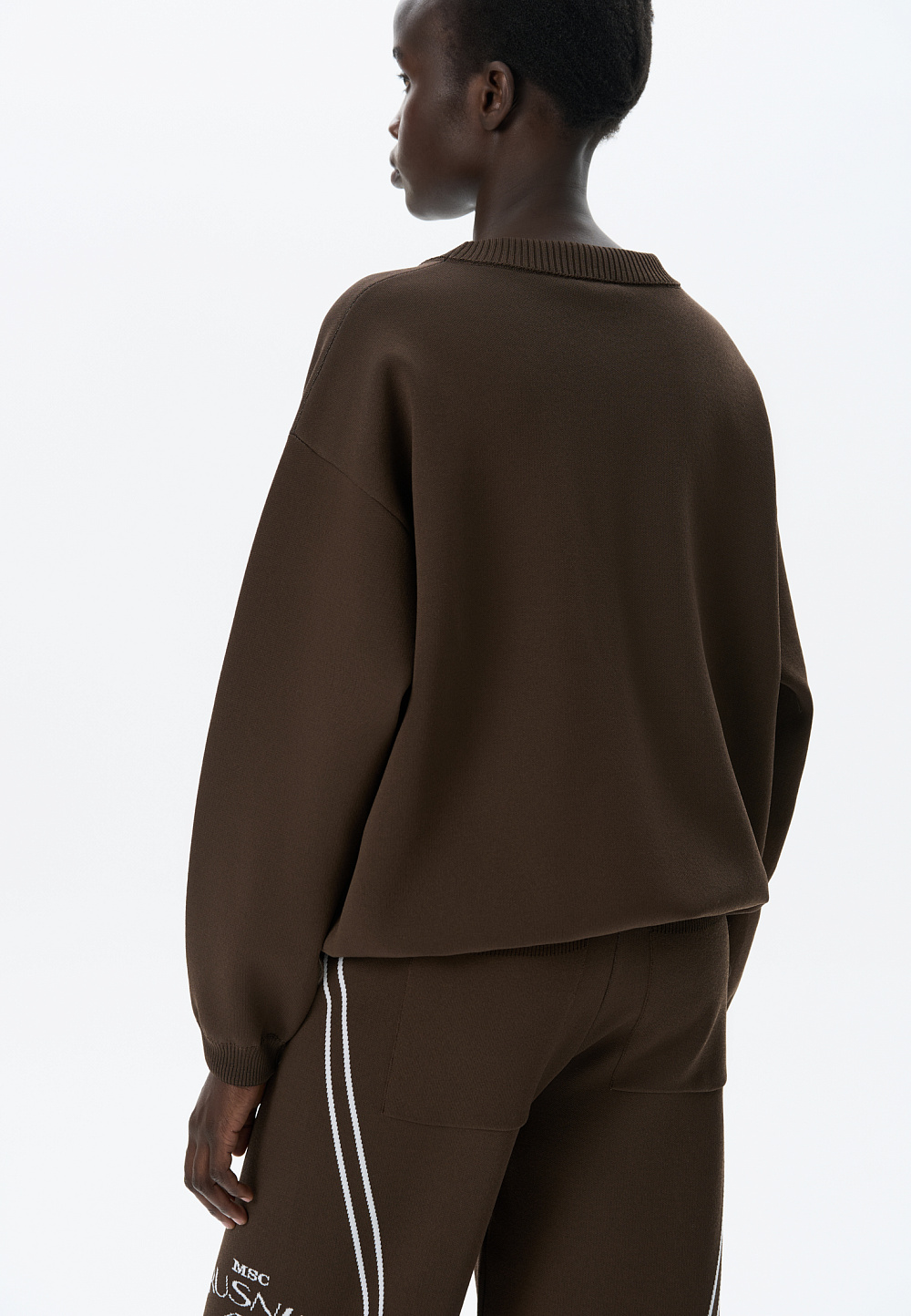 Knitted viscose jumper. Loose silhouette model with long sleeves, dropped shoulders and a round neckline. The edges are ribbed. The product is decorated with branded jacquard.