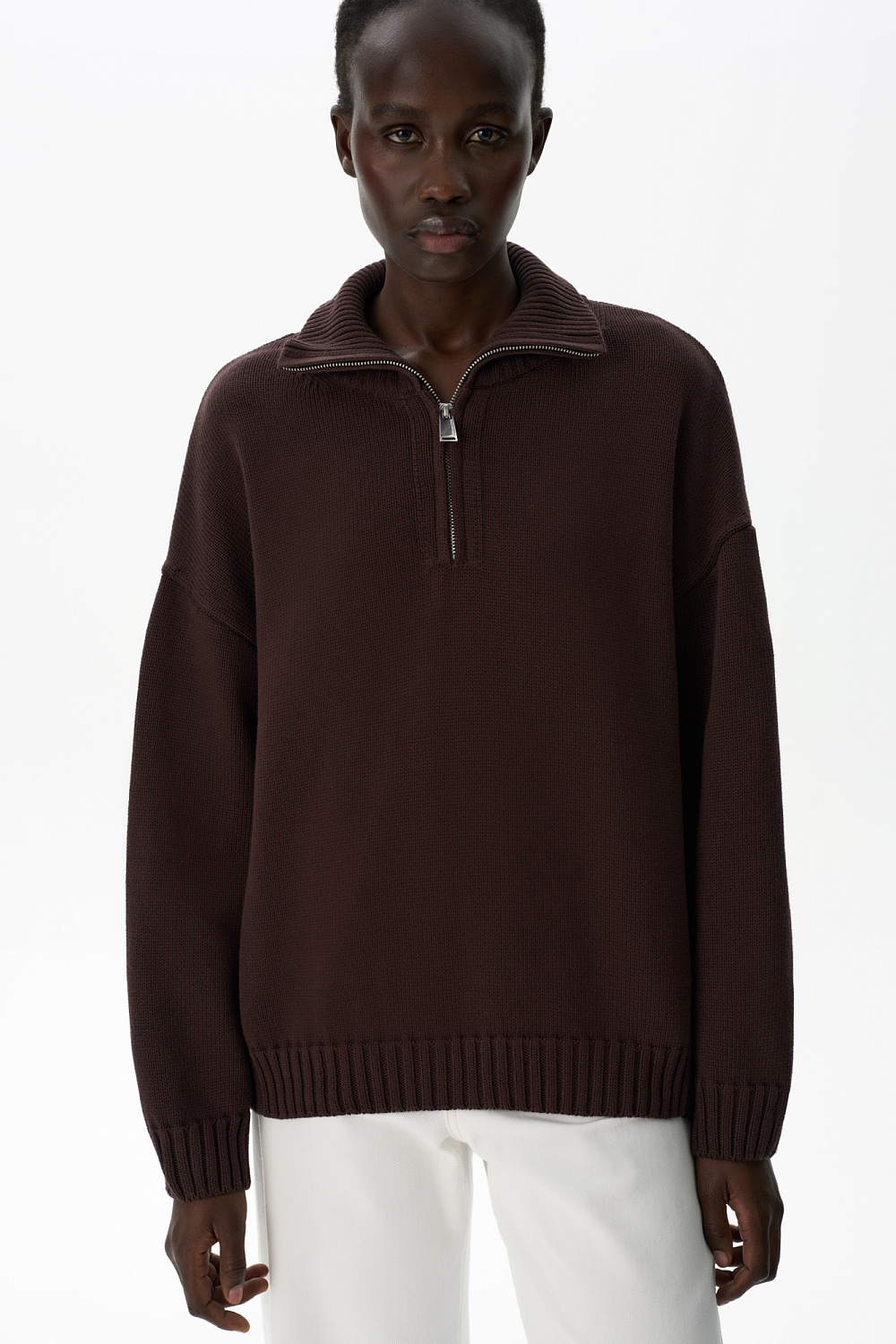 100% cotton jumper with stand-up collar. Zip closure at the top in front, ribbed edges and cuffs.