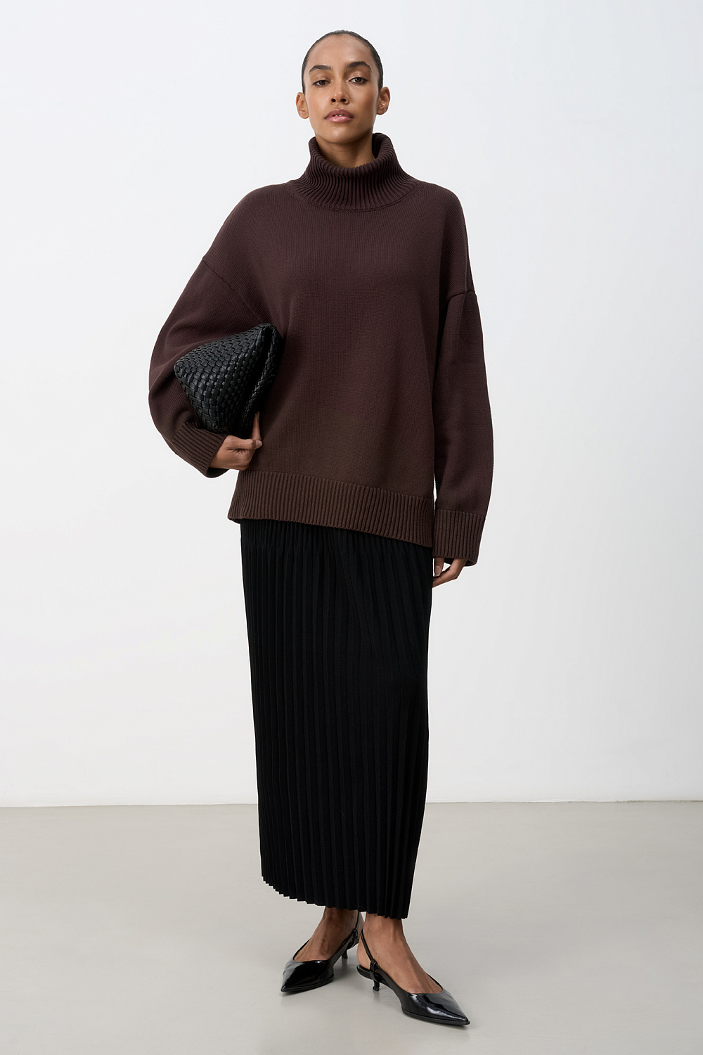 Loose 100% cotton knitted jumper with a high collar and dropped shoulders.