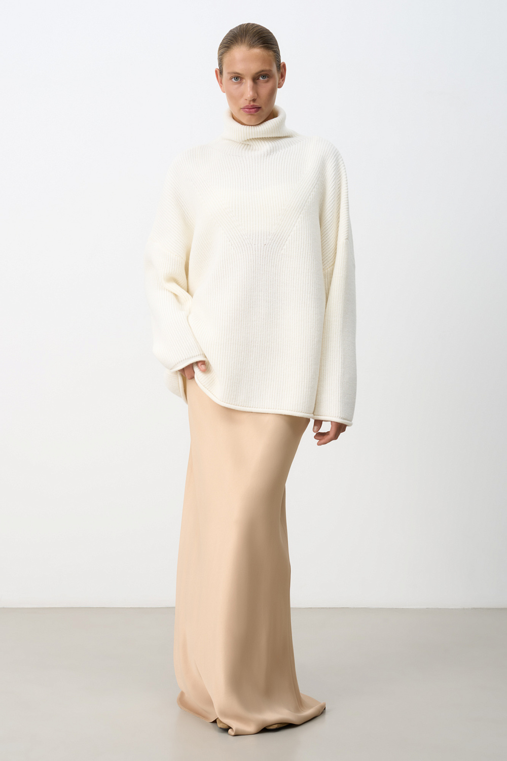 Knitted jumper with a high neck. Model of a loose silhouette with a dropped shoulder line and decorative allowances.