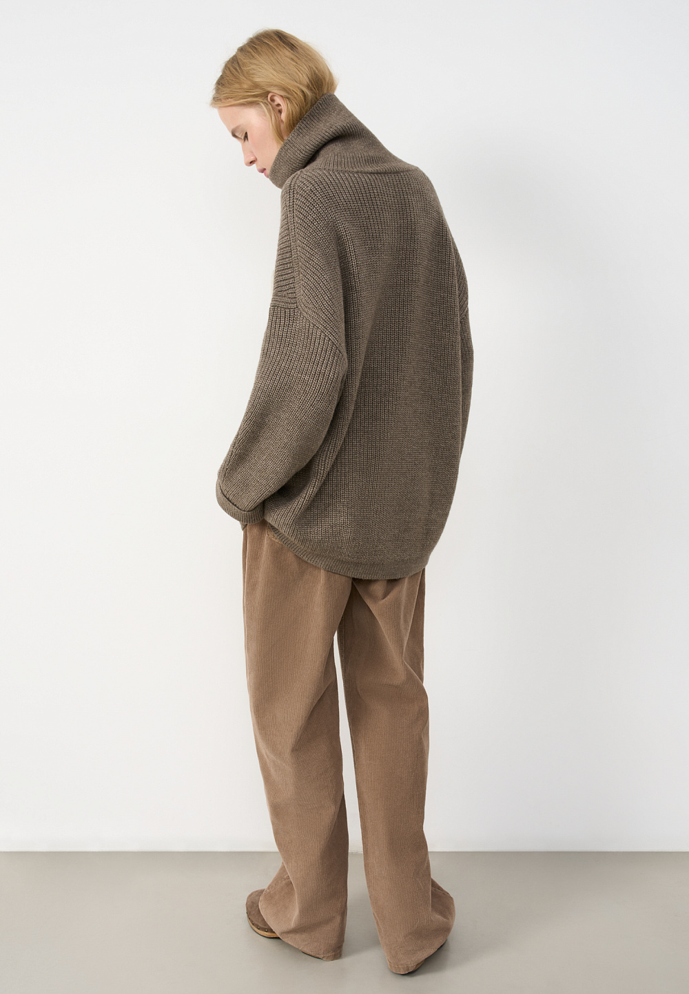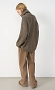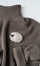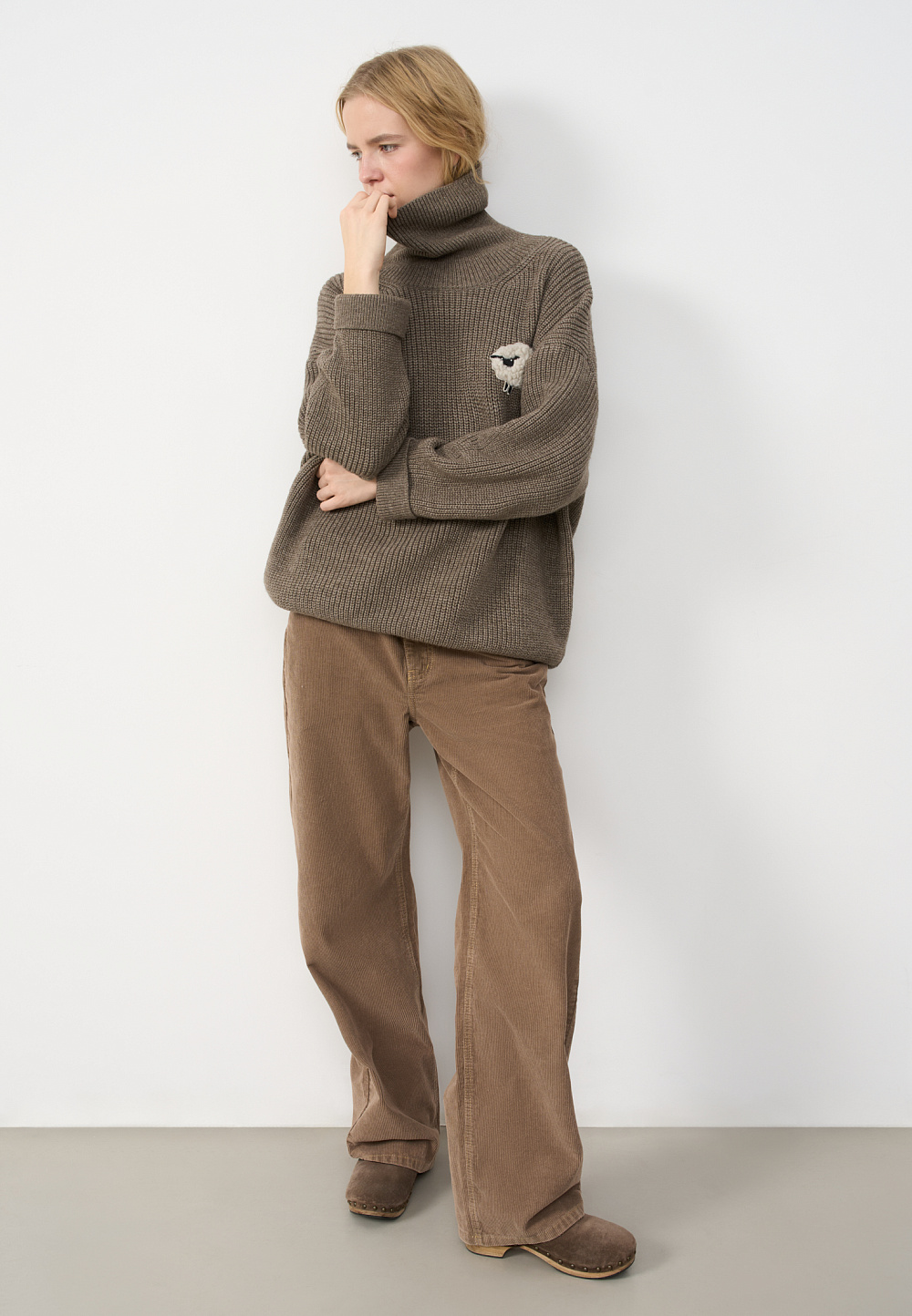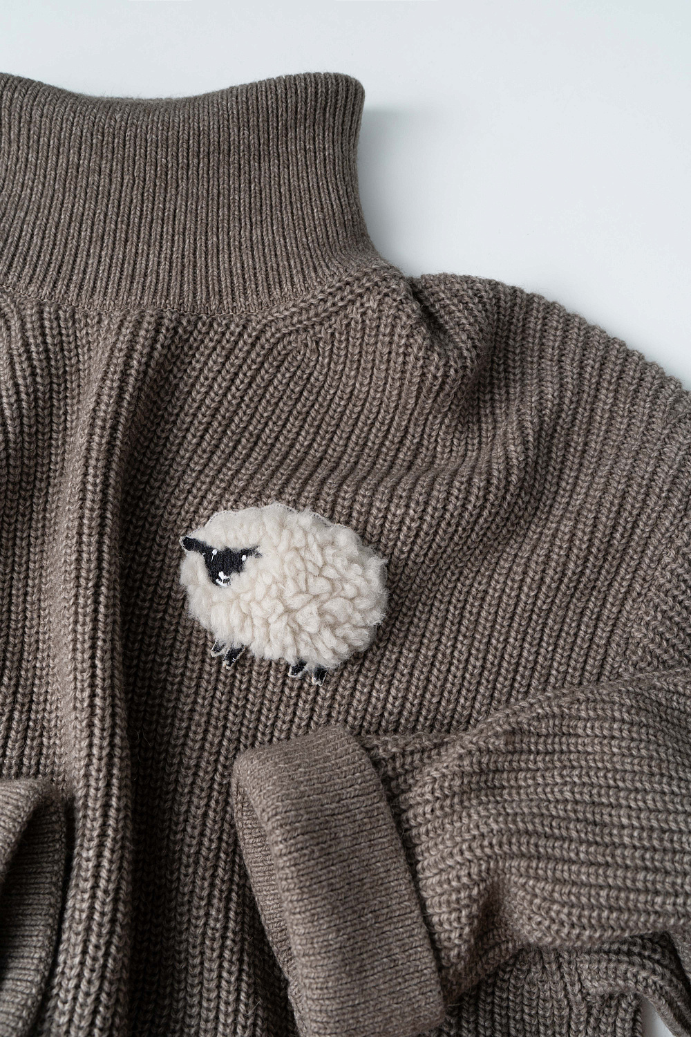 Alpaca wool knitted jumper. The model has a loose silhouette, with a high knitted neck, dropped shoulders and long sleeves with cuffs. The product is decorated with a three-dimensional element in the shape of a lamb.