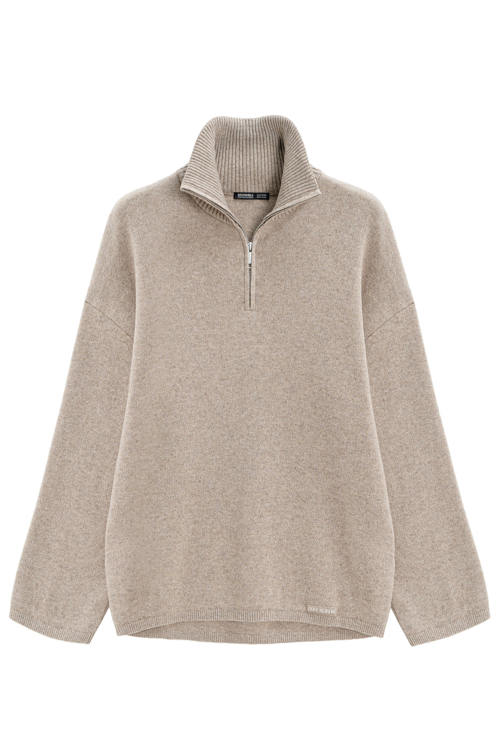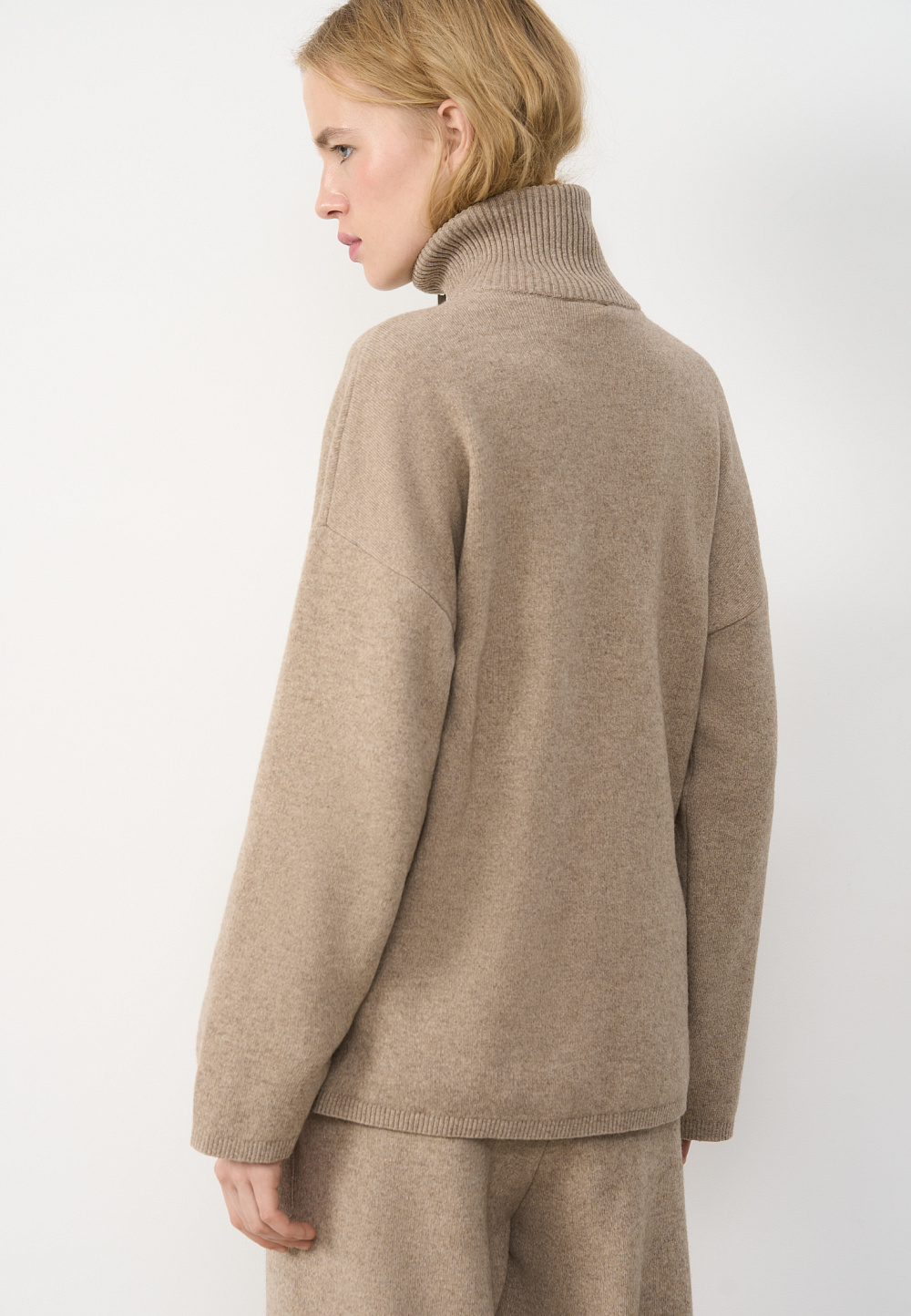 Knitted jumper made of cashmere and wool. The model has a loose fit, with a high collar with a zipper and dropped shoulders. The collar and edges of the product are ribbed.