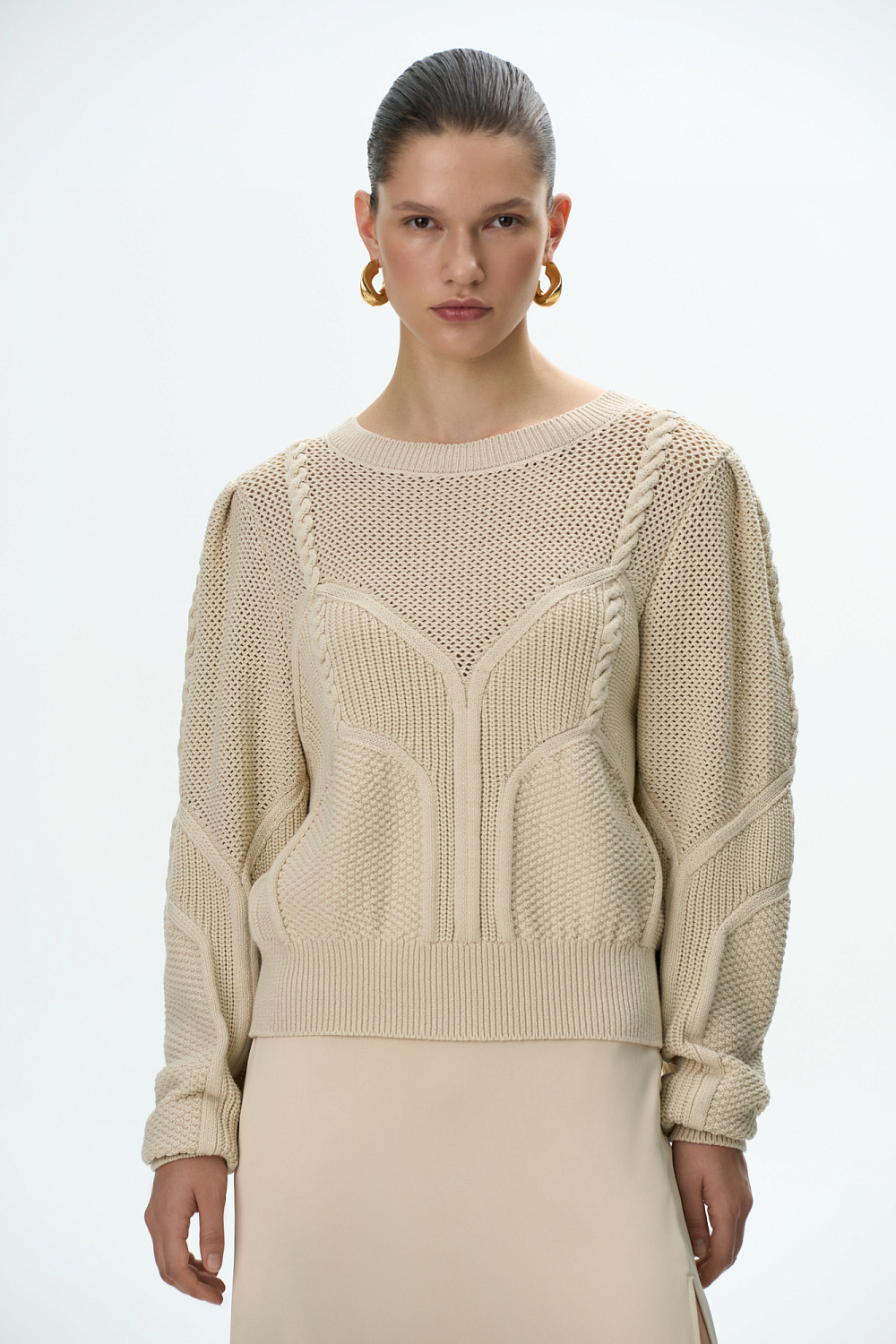 Cotton jumper with round neck and puff sleeves. Openwork pattern with cable-knit details.