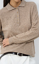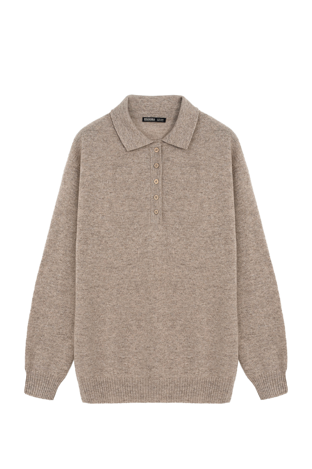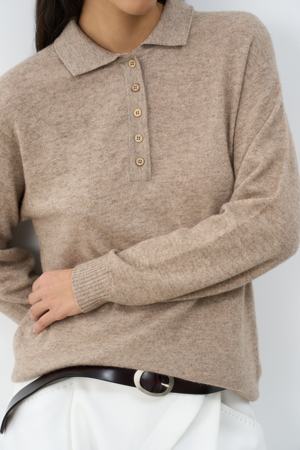 Knitted jumper made of cashmere and wool. Straight silhouette with dropped shoulders and a polo collar with buttons. The sleeve cuffs and hem are ribbed.