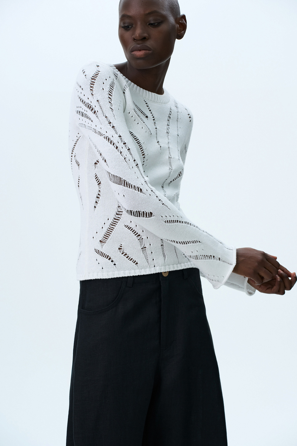 100% cotton textured knit jumper. Long flared sleeves, ribbed neckline.