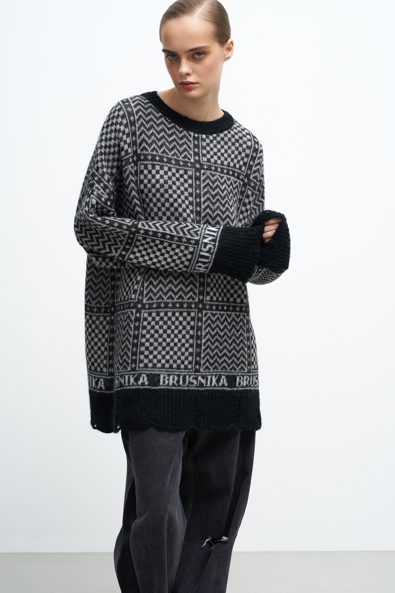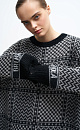 Jumper in a wool-mohair blend with a jacquard check pattern. Loose silhouette, dropped shoulders, ripped hem and cuffs.