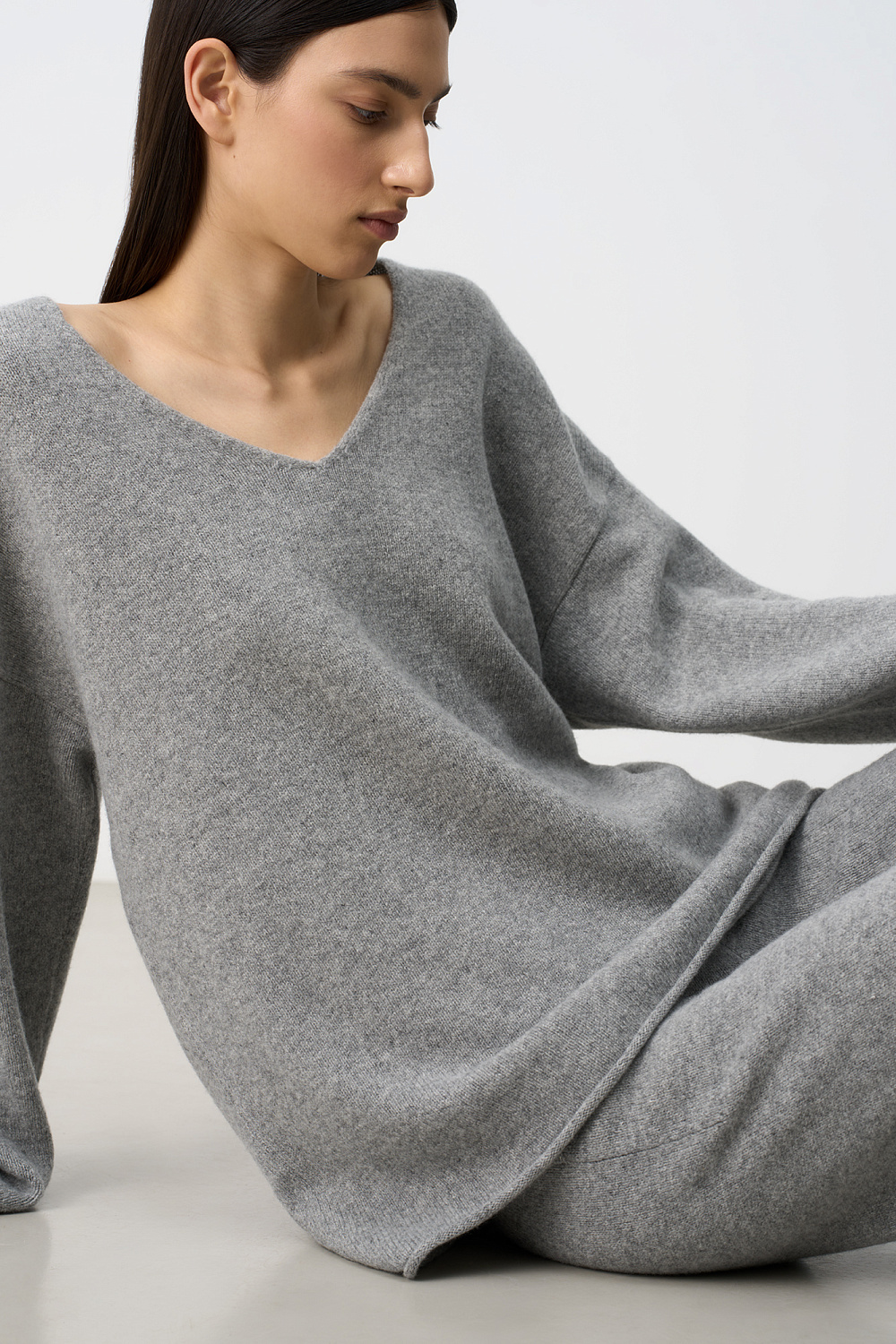 Knitted jumper with V-neck made of 100% cashmere. Loose silhouette model with dropped shoulder line. You can complement the look with trousers in the same style.