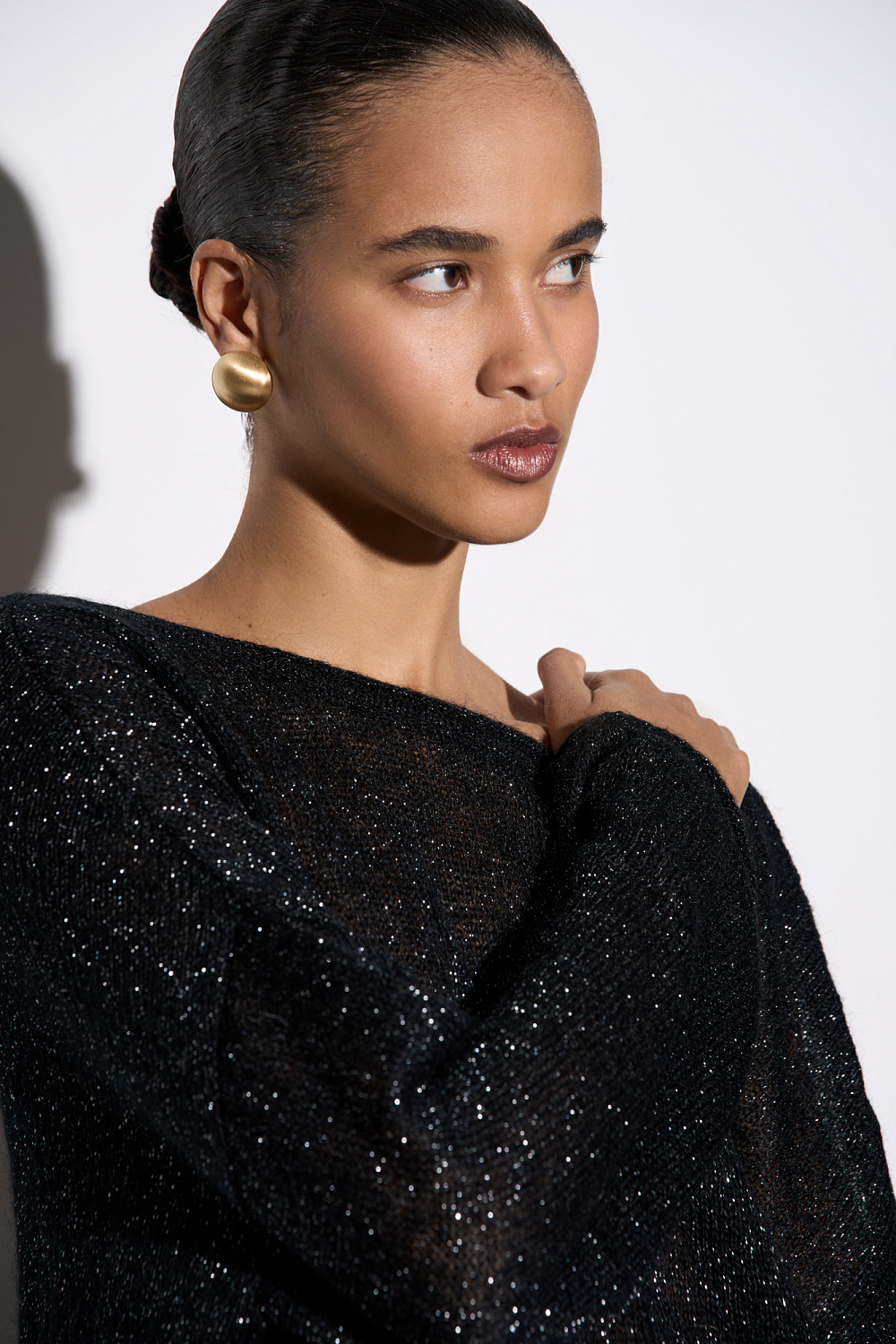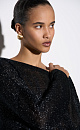 Translucent knitted jumper with lurex. Loose silhouette model with long sleeves and a deep cutout at the back.