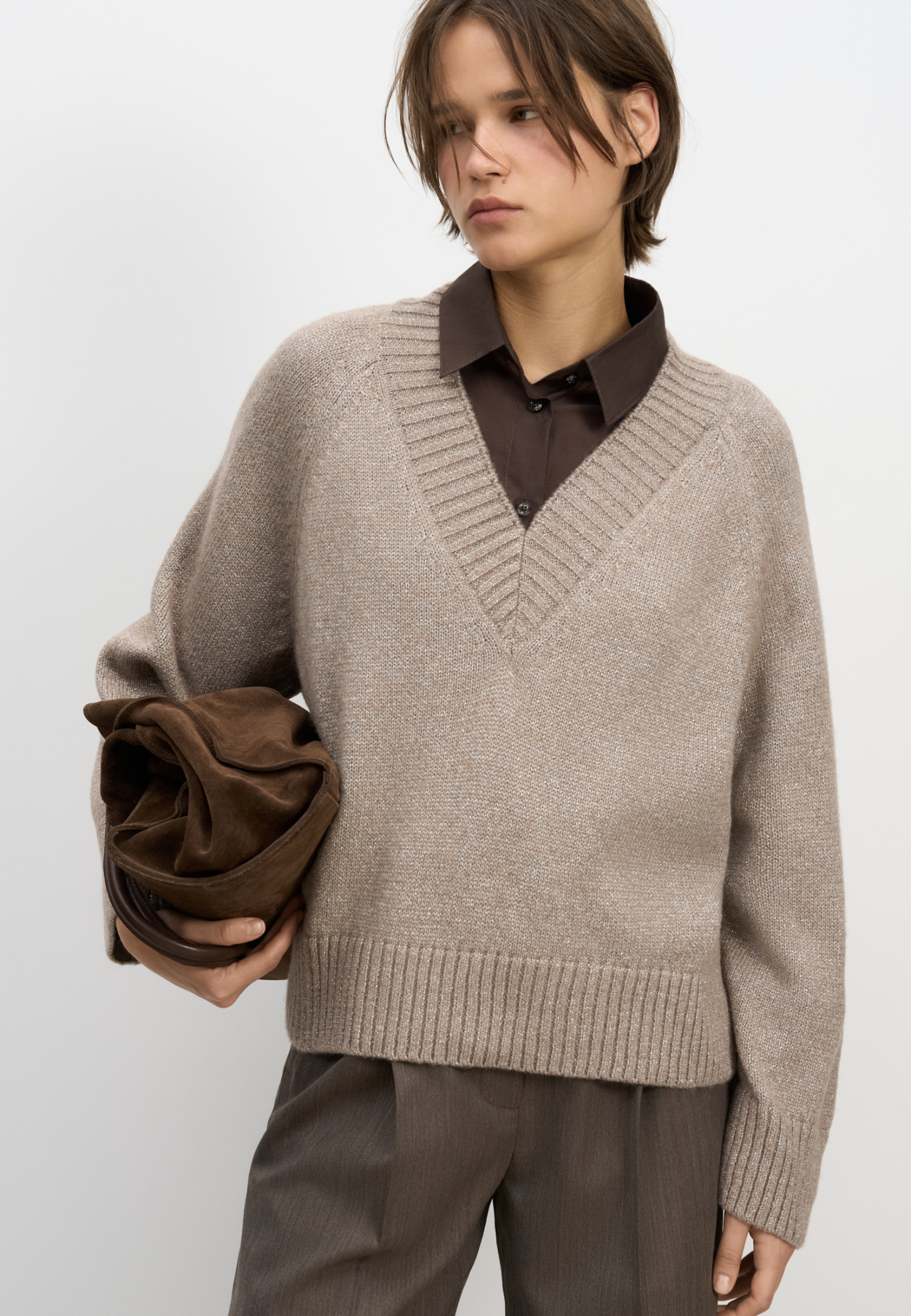 Knitted jumper made of merino wool with lurex. Loose silhouette model with V-neck.