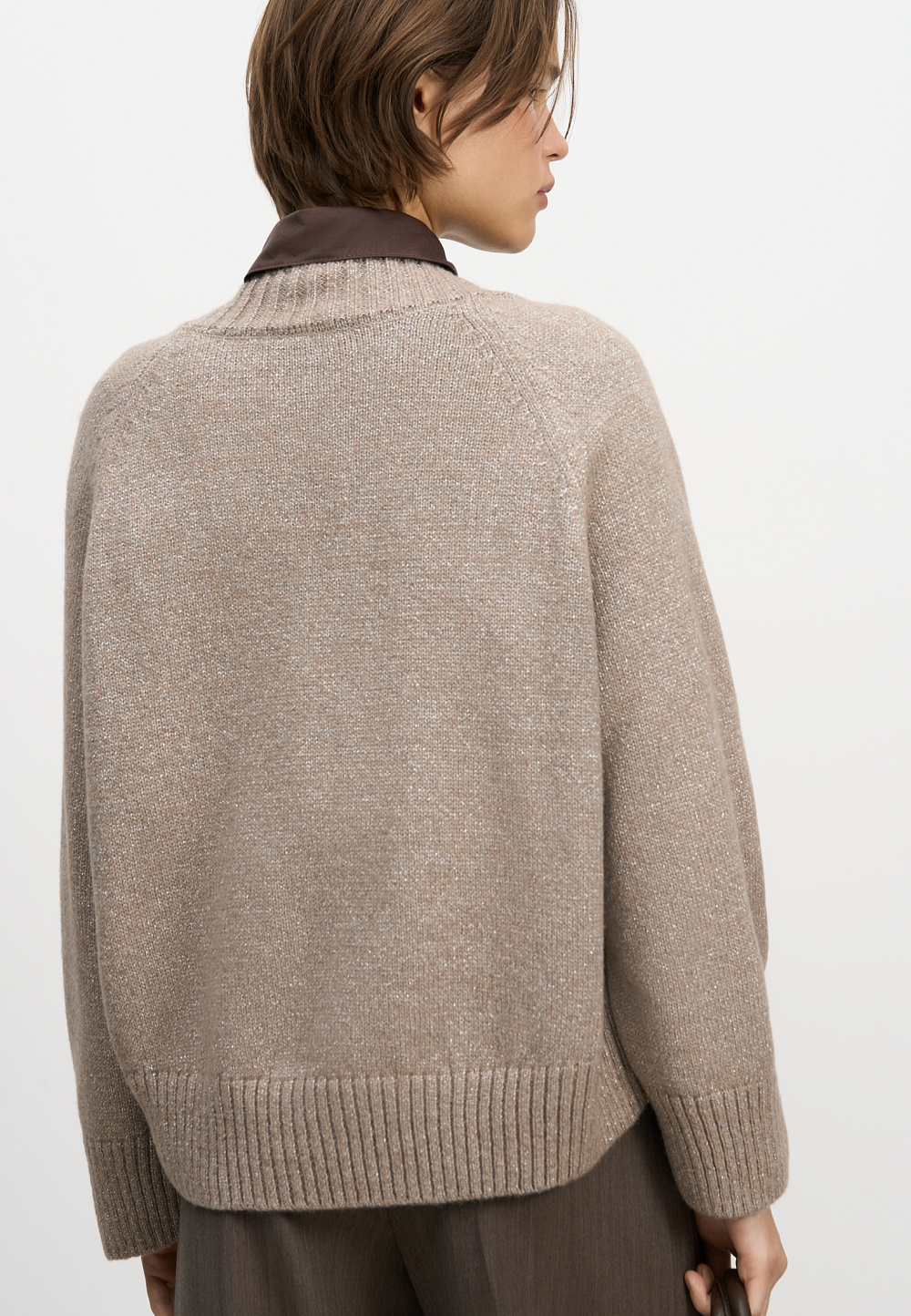 Knitted jumper made of merino wool with lurex. Loose silhouette model with V-neck.