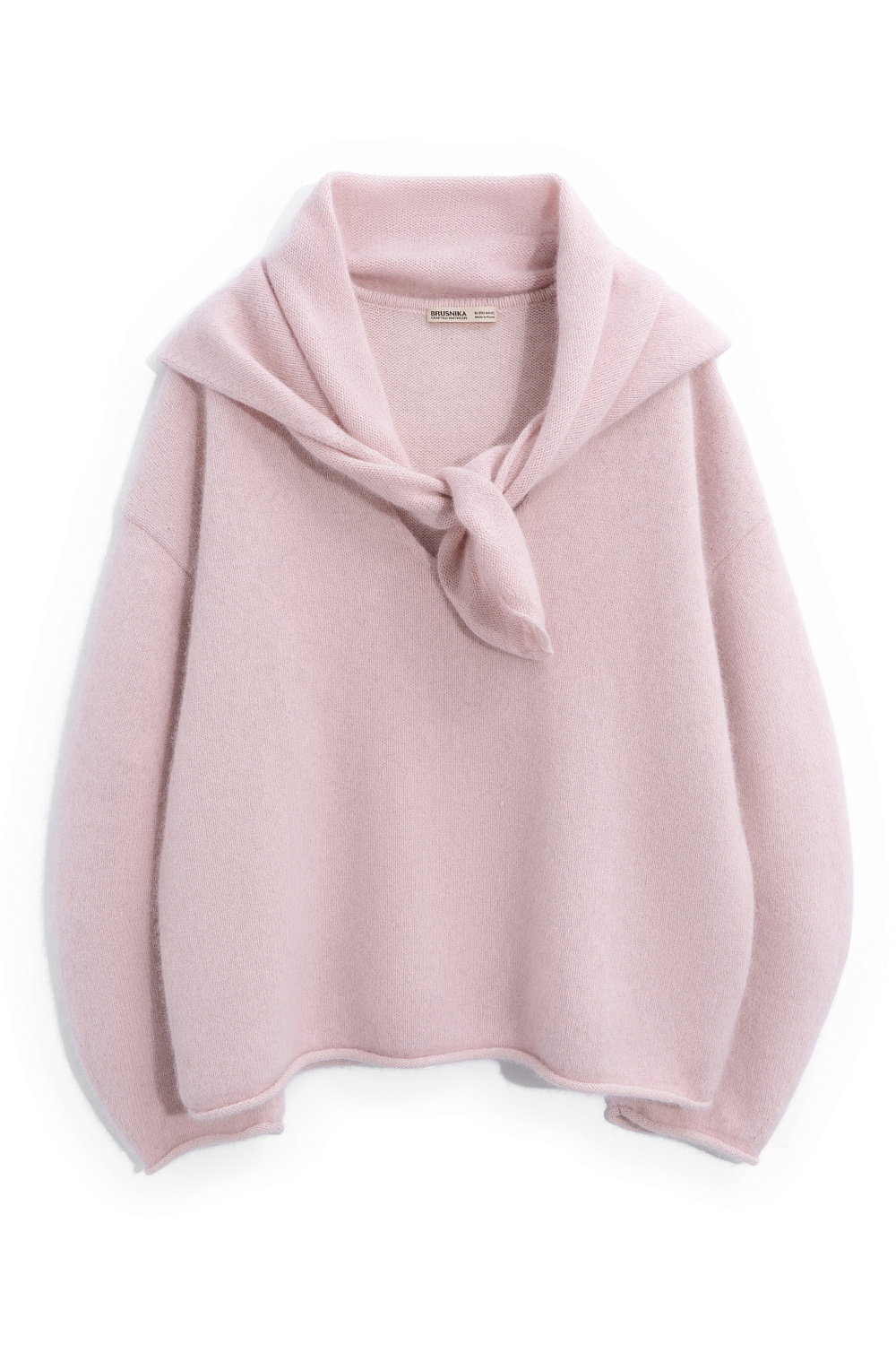 Oversized knitted jumper made from fox down. Model with a deep V-neck, dropped shoulders, long wide sleeves and rolls at the hem. You can complement the look with a skirt.