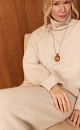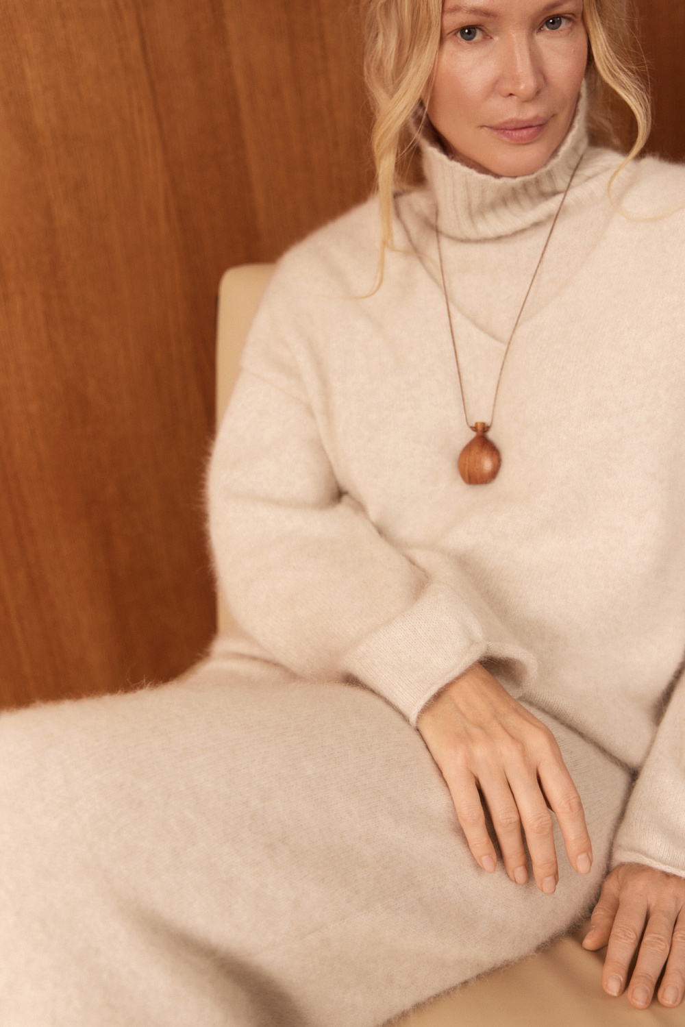 Oversized knitted jumper made from fox down. Model with a deep V-neck, dropped shoulders, long wide sleeves and rolls at the hem. You can complement the look with a skirt.