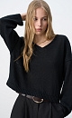 Knitted jumper made of 100% linen with a V-neck. Model of a straight silhouette with long sleeves and an elongated back. The edges of the product are ribbed.