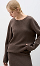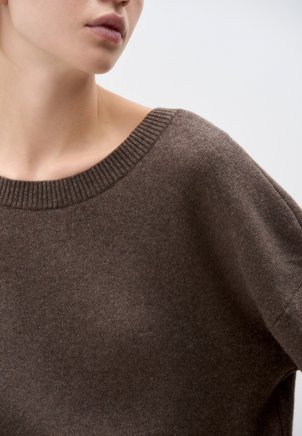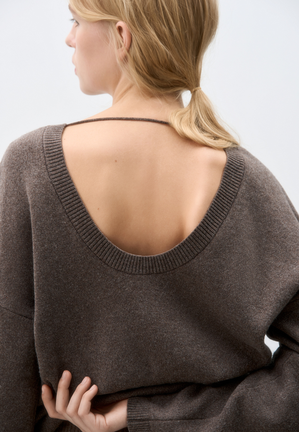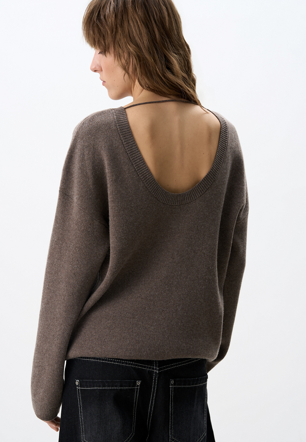Knitted jumper made of cashmere and wool. Loose silhouette model with long sleeves and a deep neckline with a jumper at the back. The edges of the product are ribbed.