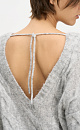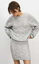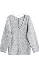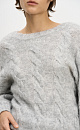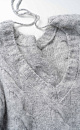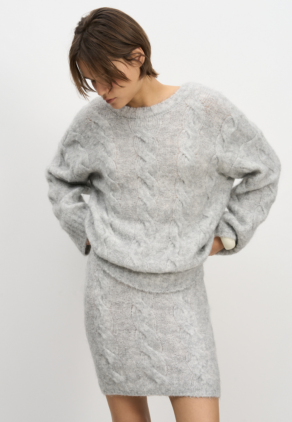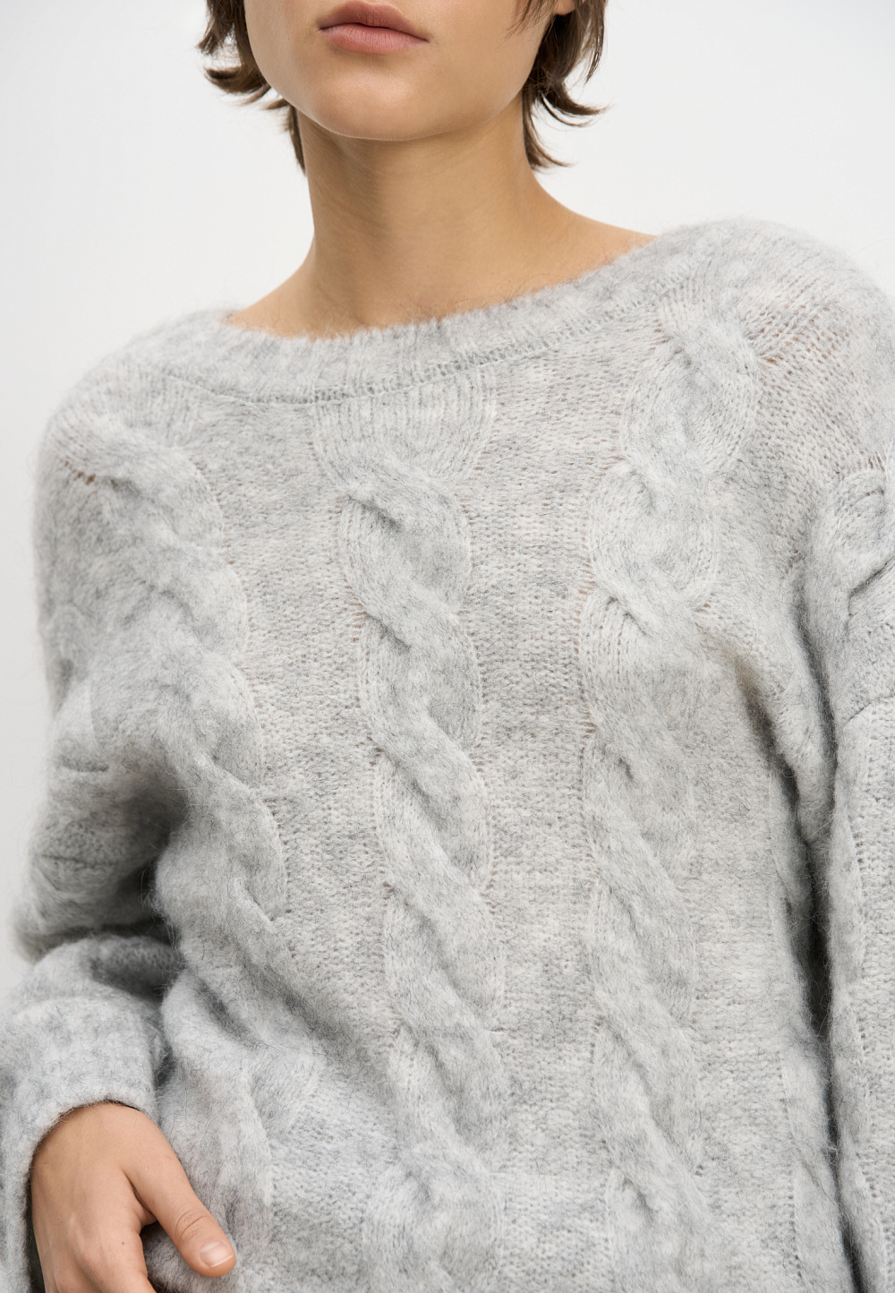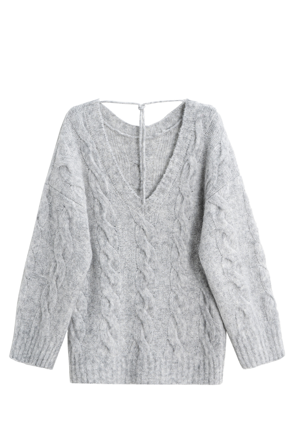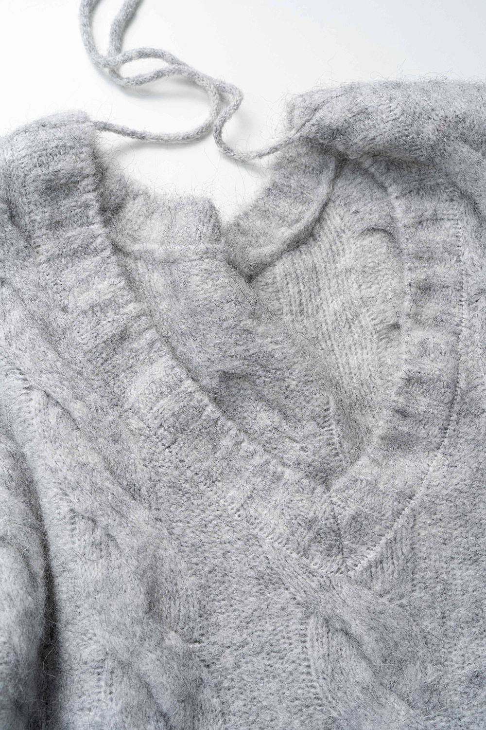 Knitted jumper made of wool and mohair. The model has a loose silhouette with dropped shoulders, long sleeves, a round neckline and a deep cutout at the back, secured with a drawstring. The product is decorated with textured knitting in the form of braids. The edges of the product are ribbed.