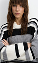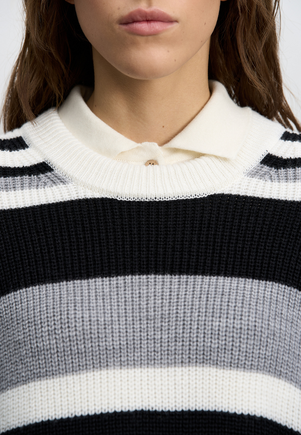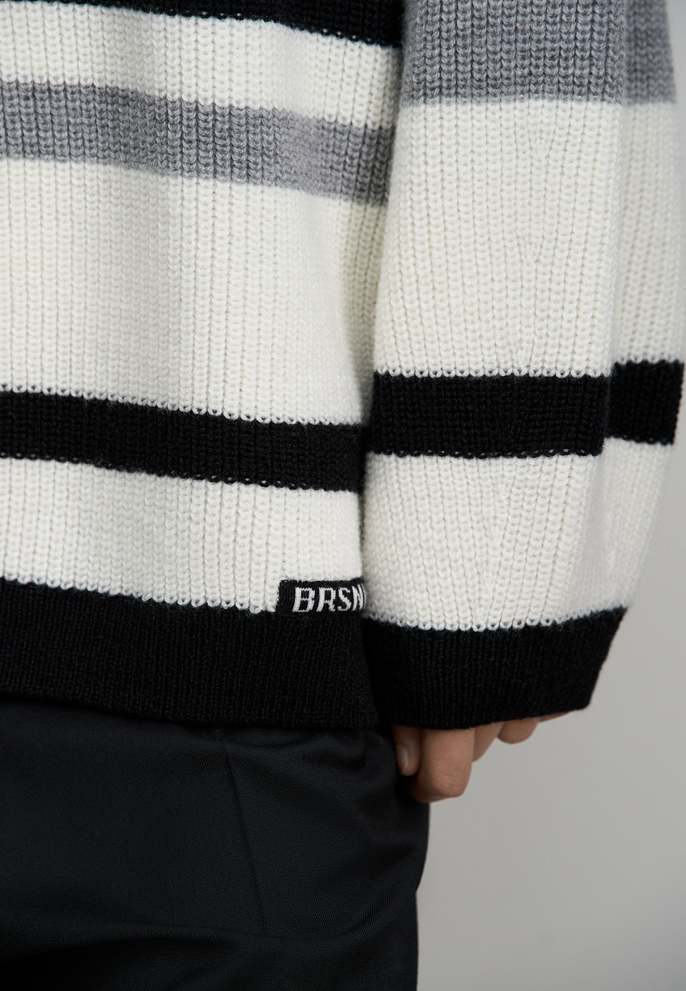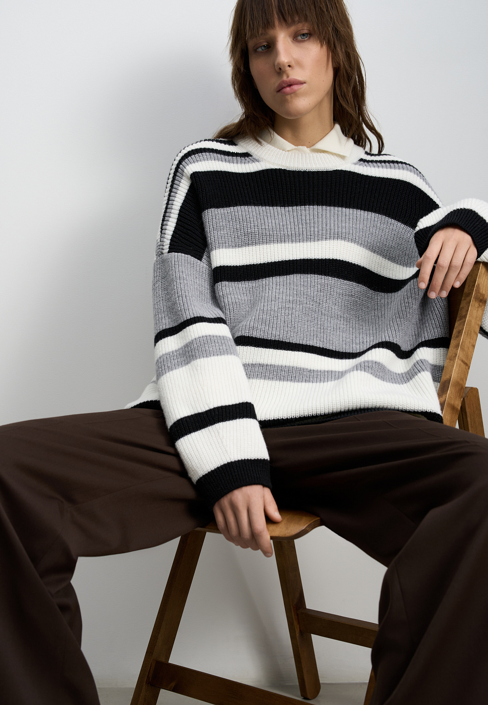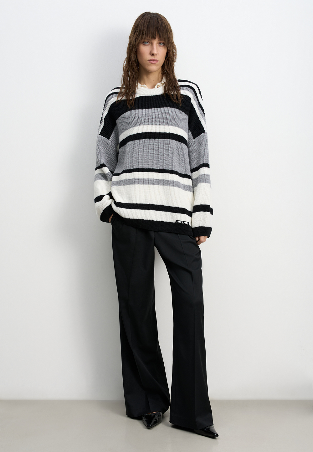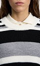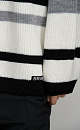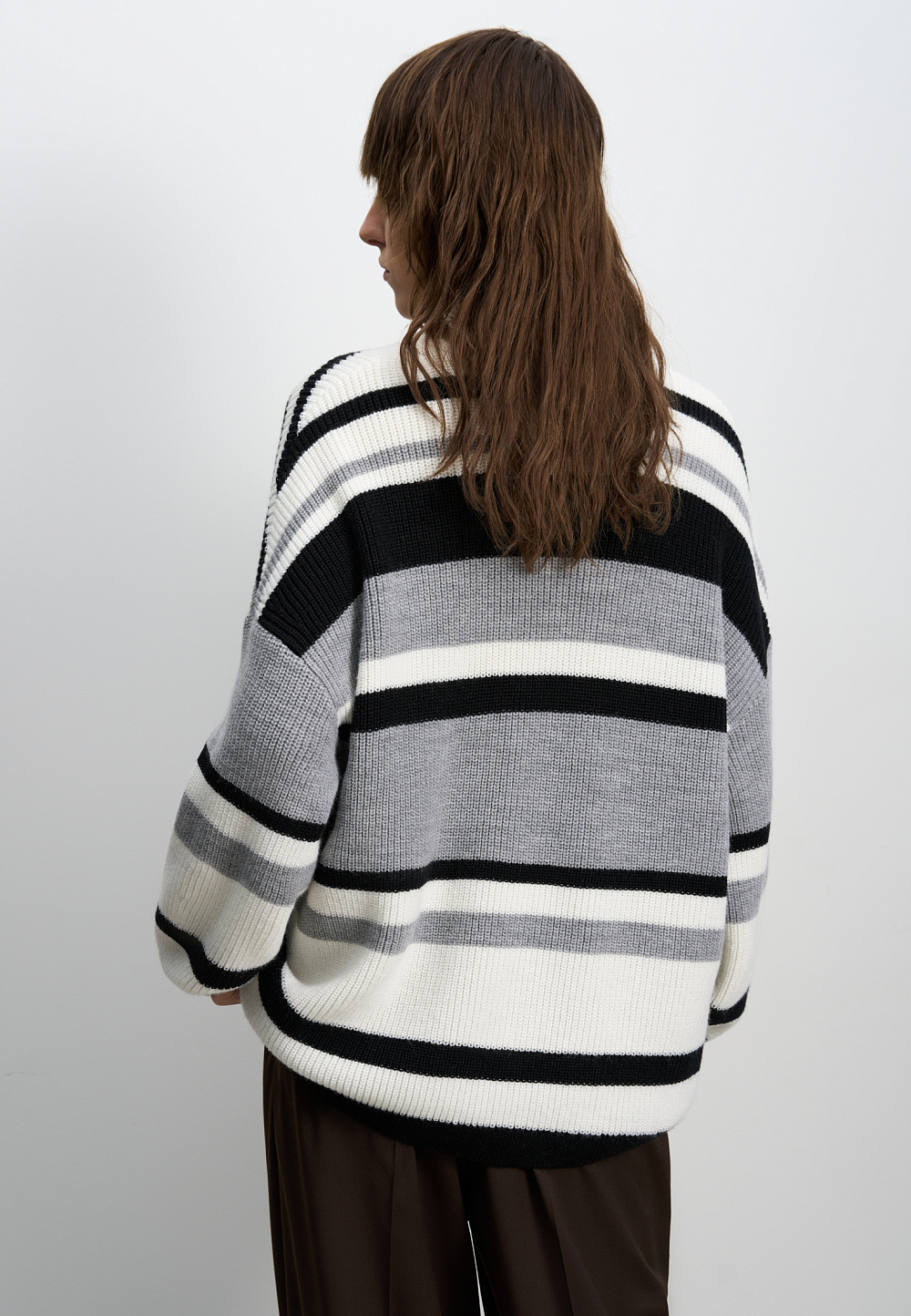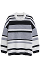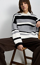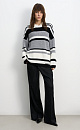 Striped wool knitted jumper. The model has a loose silhouette, with dropped shoulders, long sleeves and a round neckline. The product is decorated with a sewn-on brand logo.