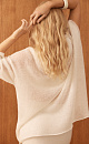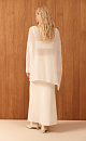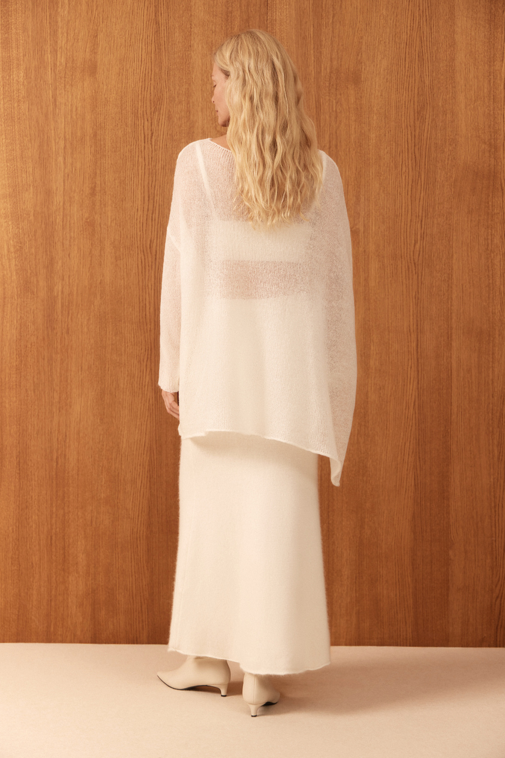 Translucent knitted jumper made of wool with the addition of mohair. Asymmetrical silhouette with one long sleeve and round neckline.