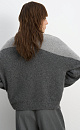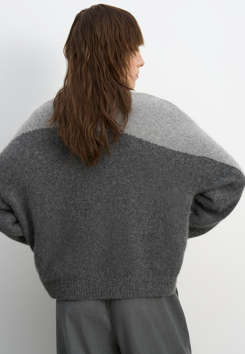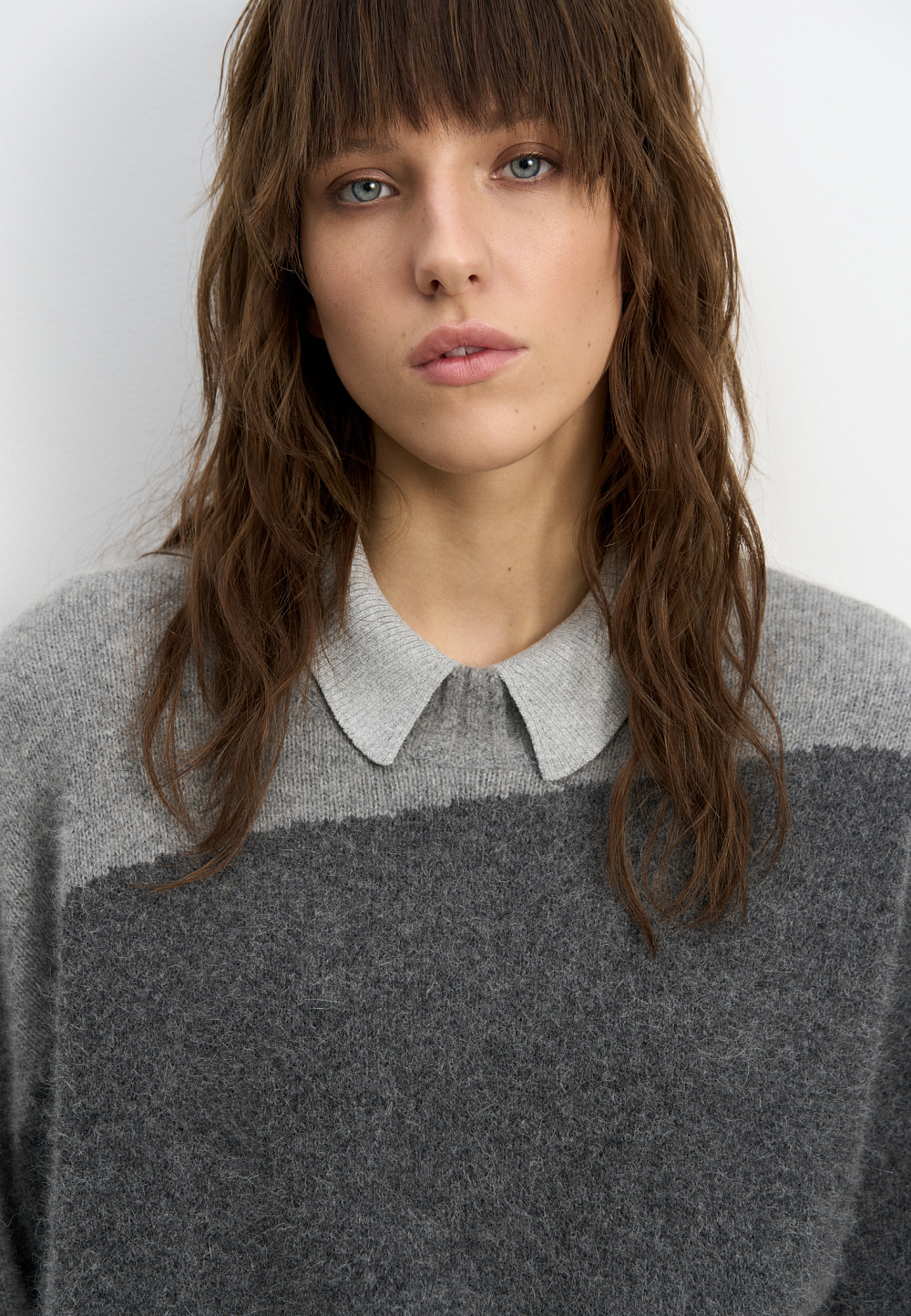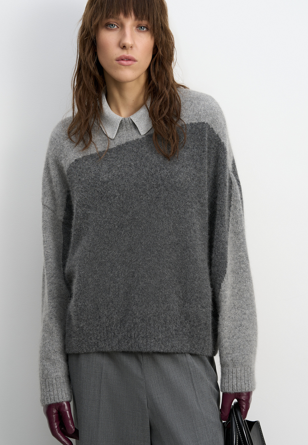 Two-color knitted jumper made of fox down. The model has a loose silhouette, with dropped shoulders and a round neckline. The edges of the product are ribbed.