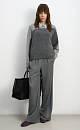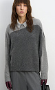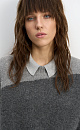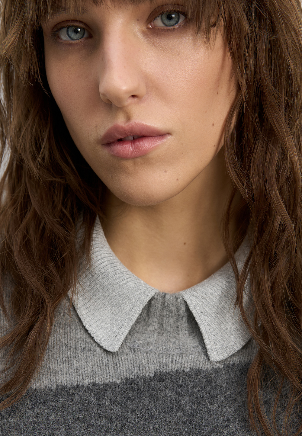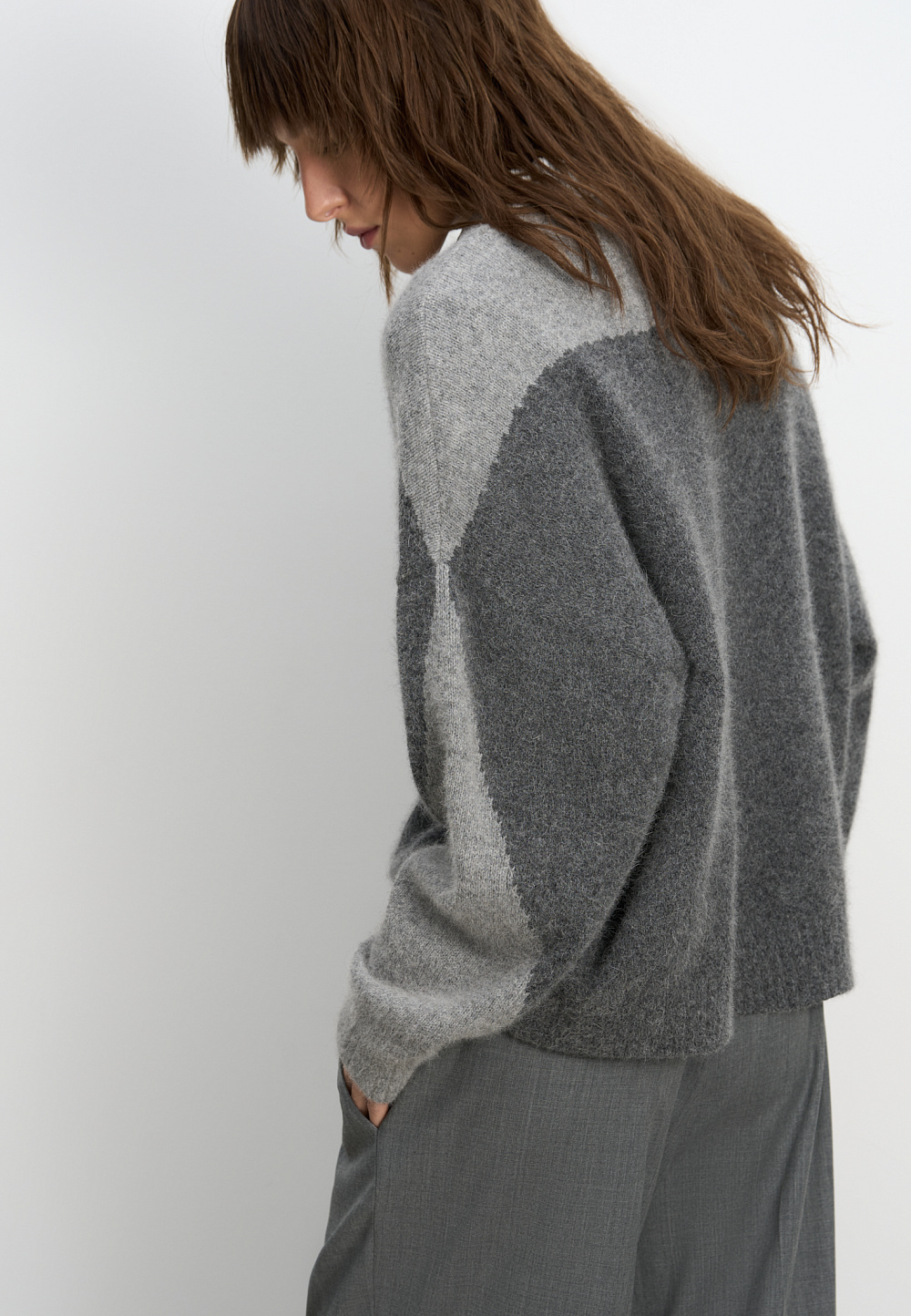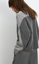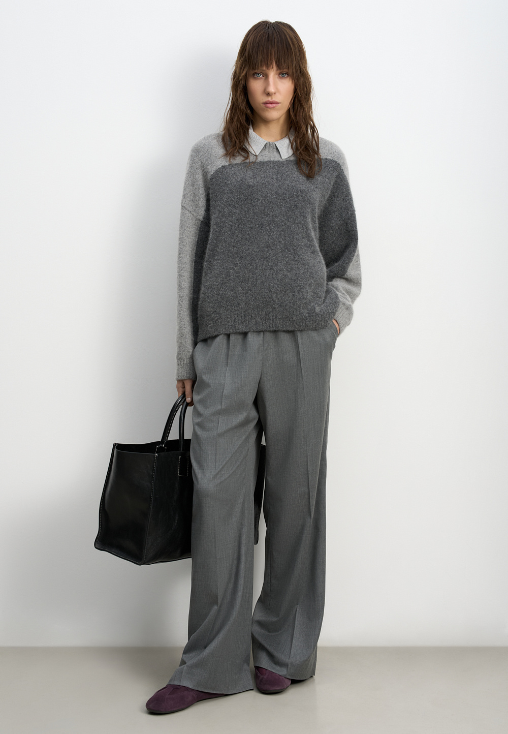 Two-color knitted jumper made of fox down. The model has a loose silhouette, with dropped shoulders and a round neckline. The edges of the product are ribbed.