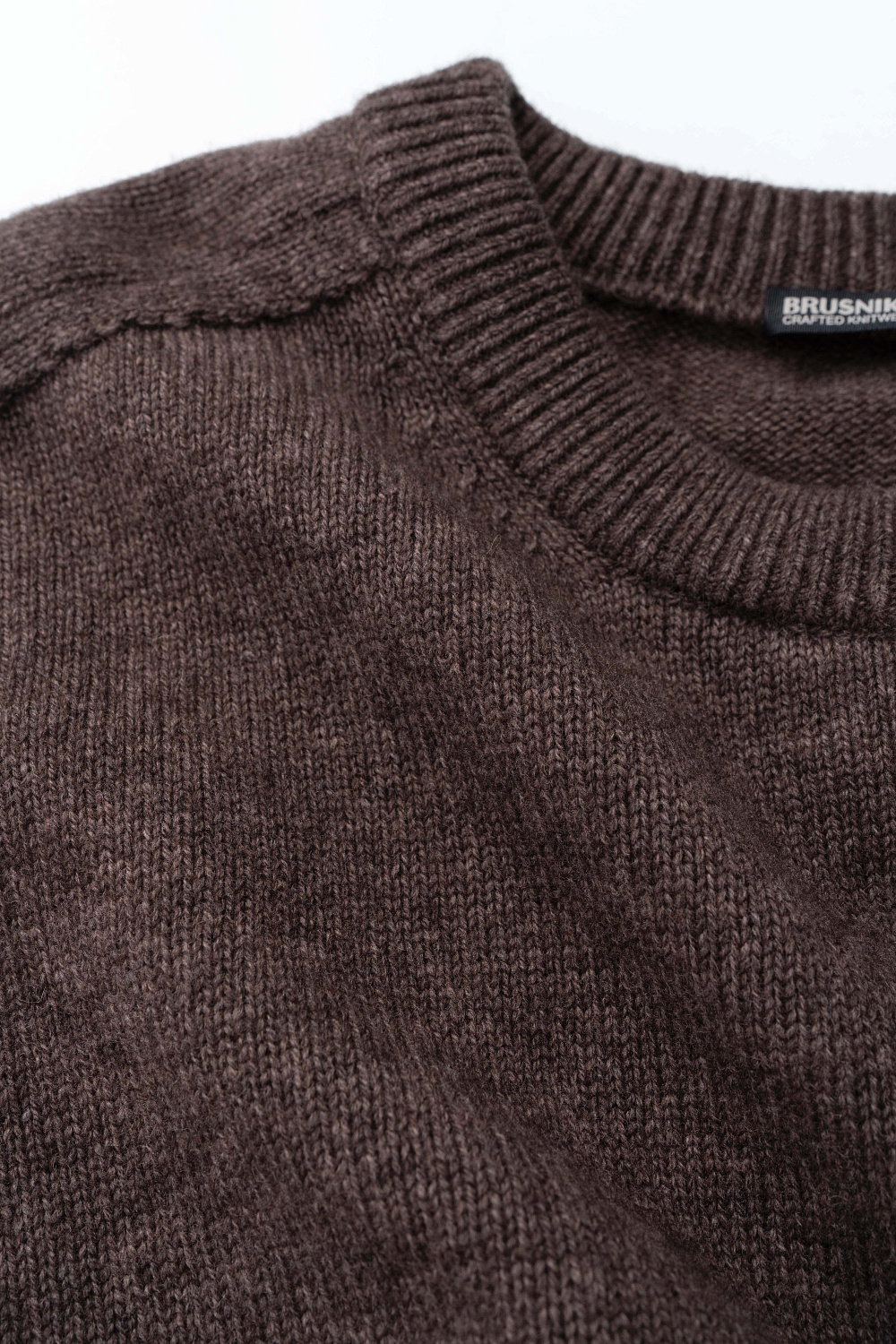 Knitted jumper made of yak wool with the addition of extrafine merino wool. Model of a loose silhouette, with a knitted round neck and raglan sleeves with decorative allowances. The hem and sleeve cuffs are ribbed.