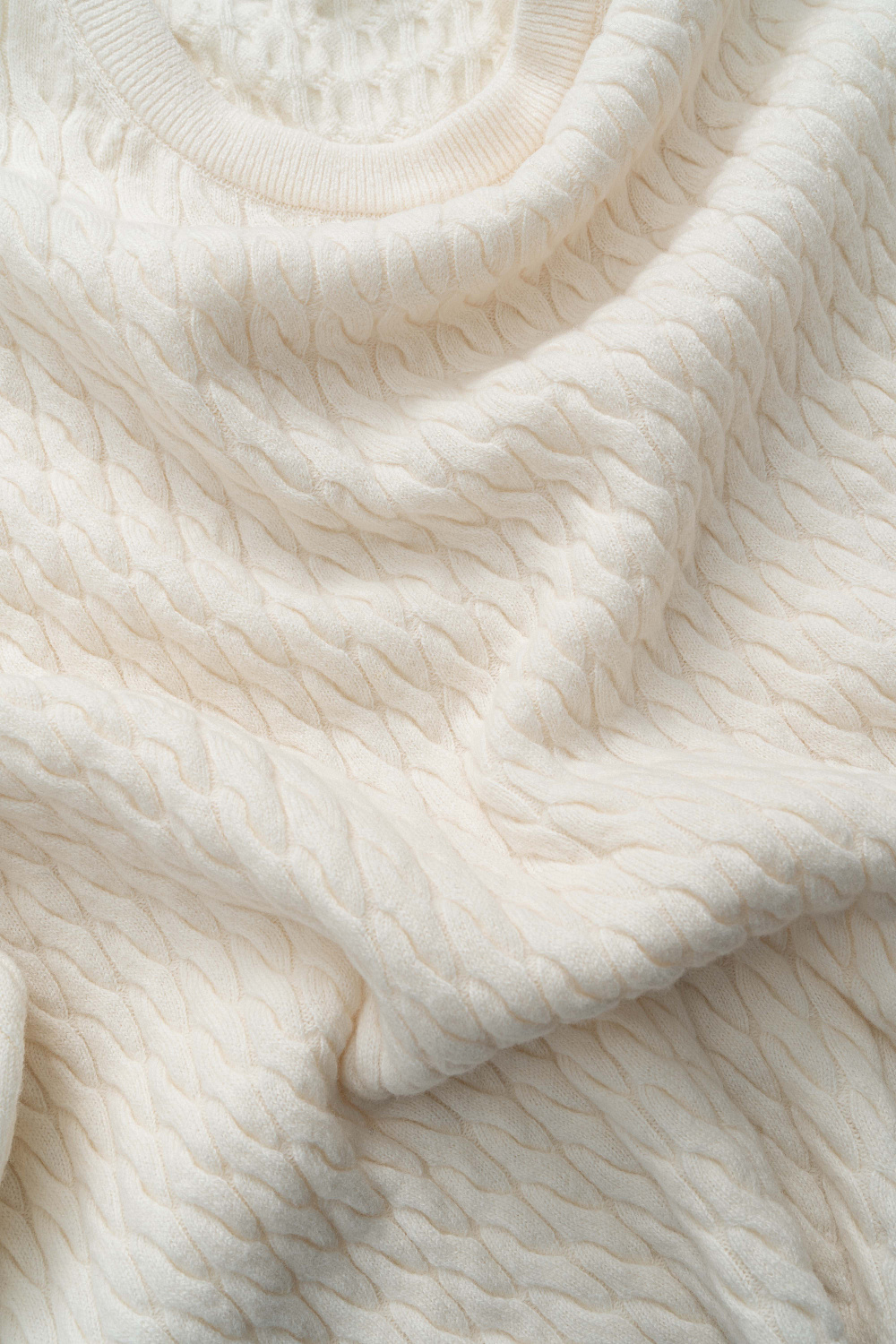 Knitted jumper with voluminous braids made from 100% extrafine merino wool. The model has a loose silhouette, with dropped shoulders and a round neckline decorated with double trim. The edges of the product are made with fine rib.