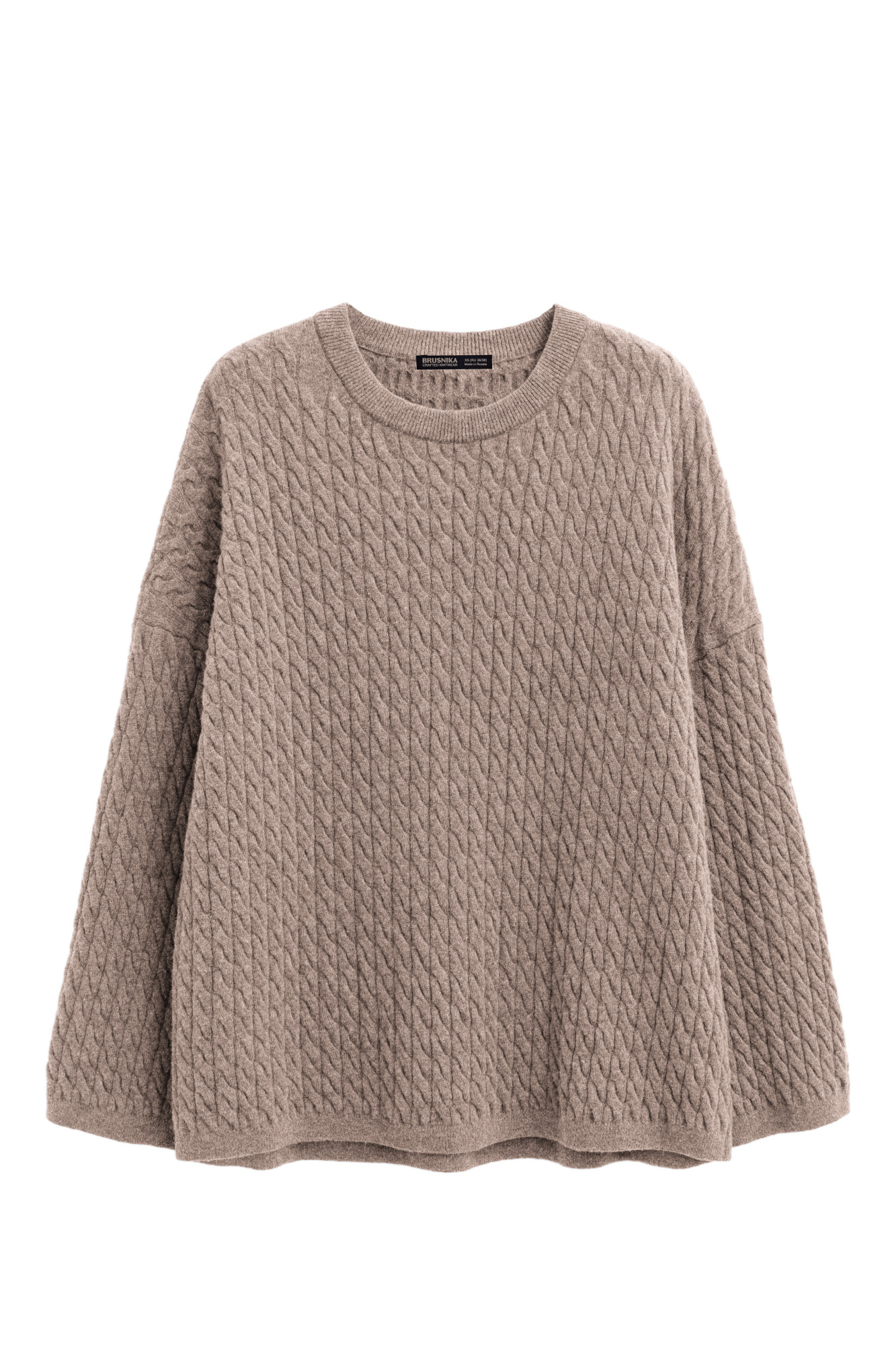 Knitted jumper with voluminous braids made from 100% extrafine merino wool. The model has a loose silhouette, with dropped shoulders and a round neckline decorated with double trim. The edges of the product are made with fine rib.