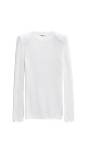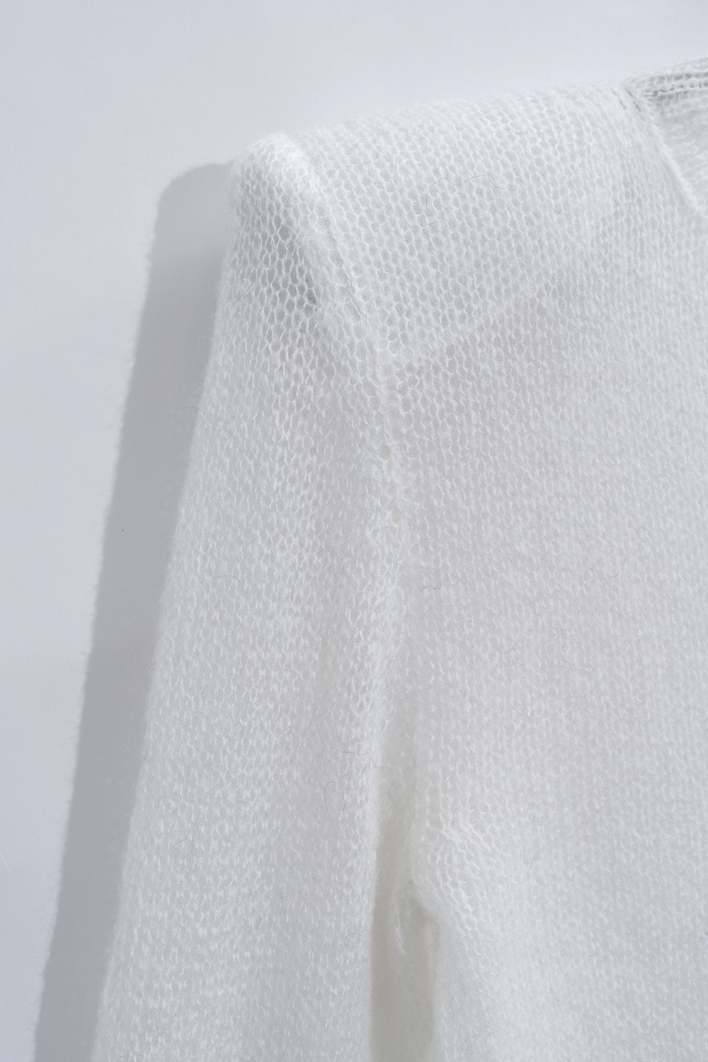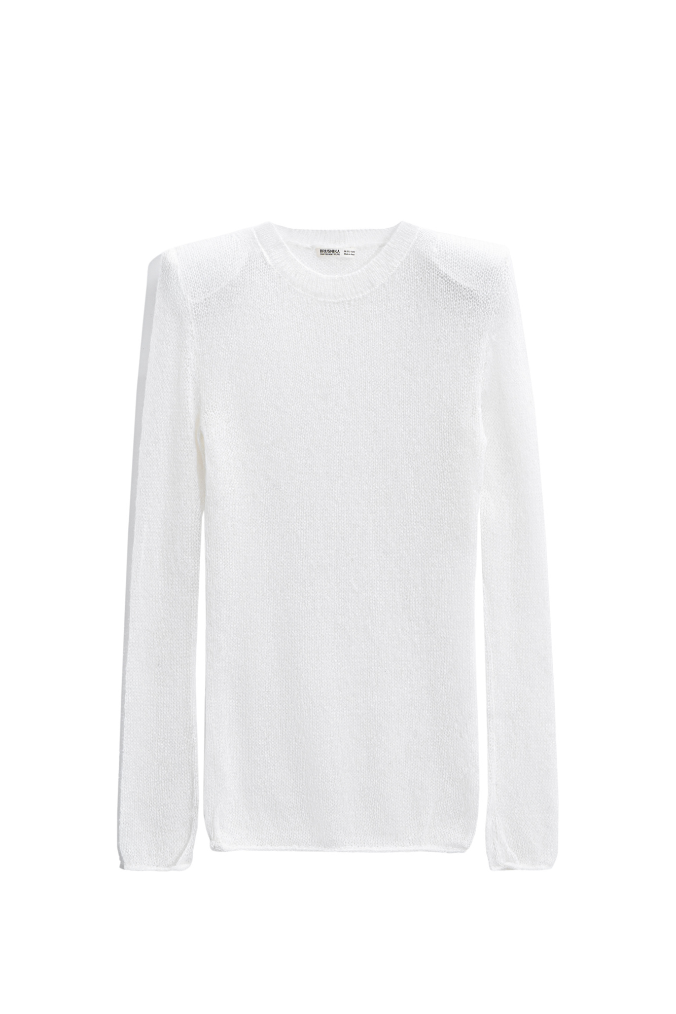 Translucent knitted jumper made of wool with the addition of mohair. Fitted model with a round neckline. Product with shoulder pads.