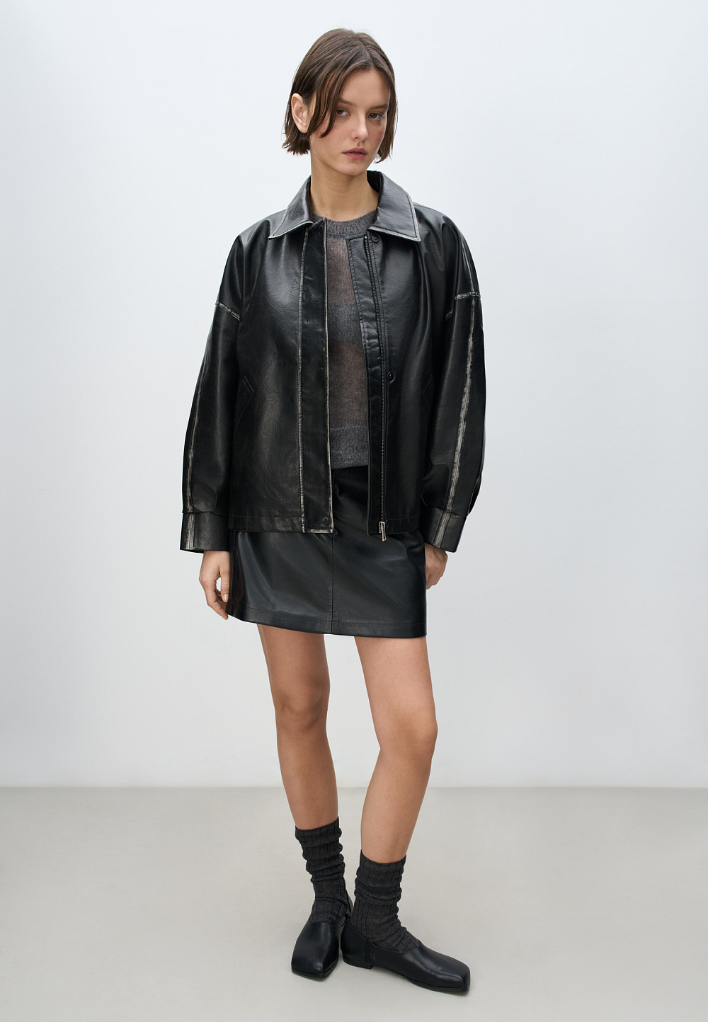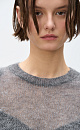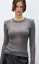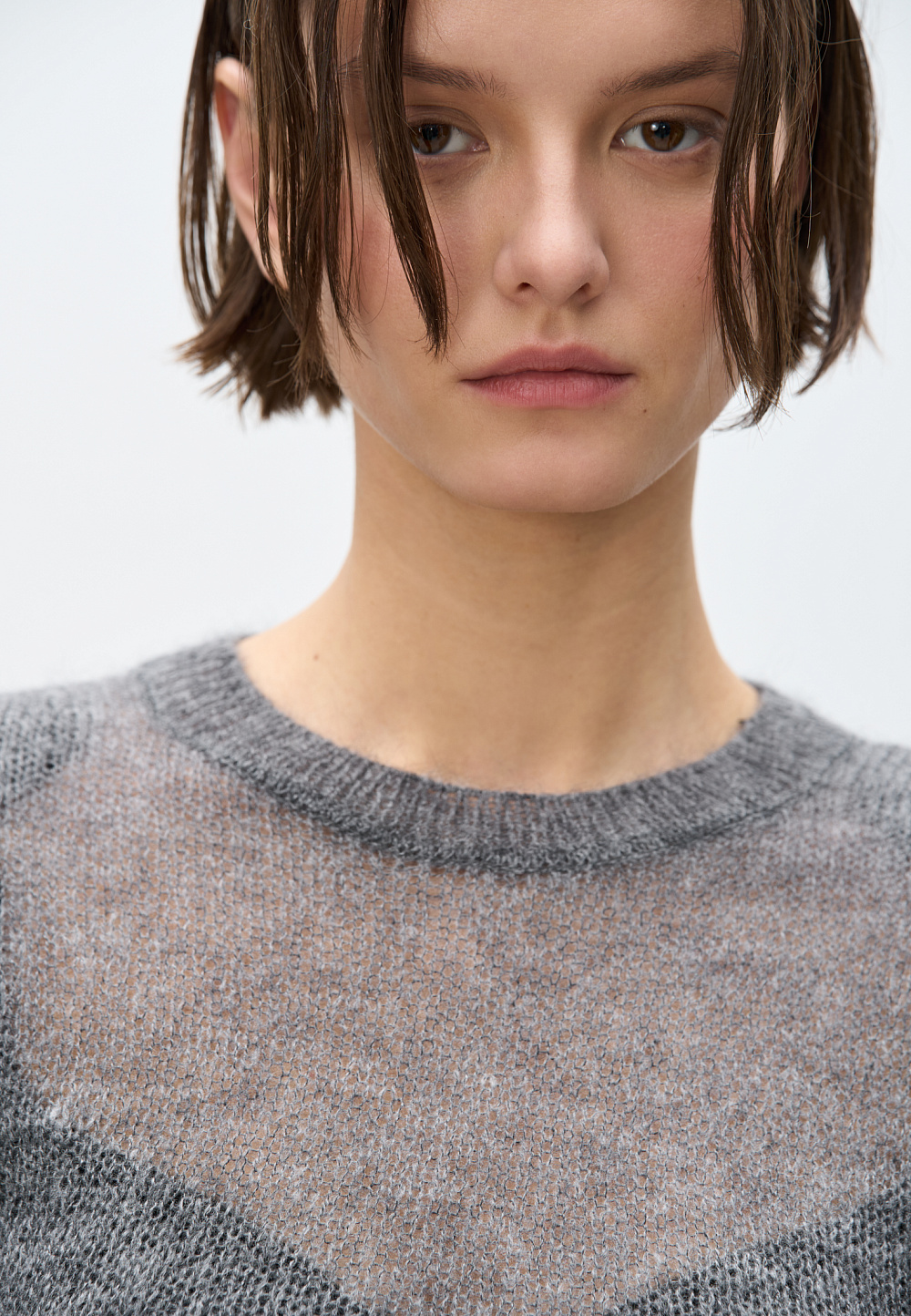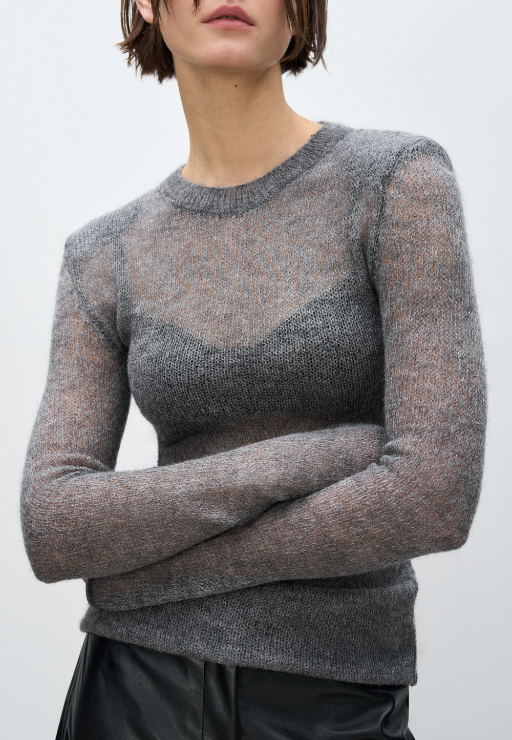 Translucent knitted jumper made of wool with the addition of mohair. Fitted model with a round neckline. Product with shoulder pads.