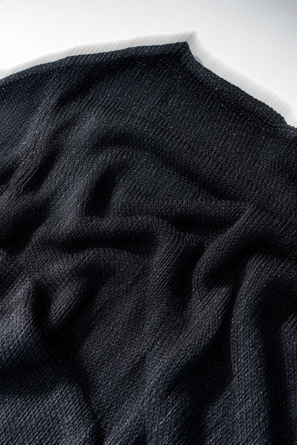 Longsleeve made of viscose with lurex. Model with a boat neckline and long sleeves. The cuffs of the sleeves and the bottom of the product are decorated with bolsters.