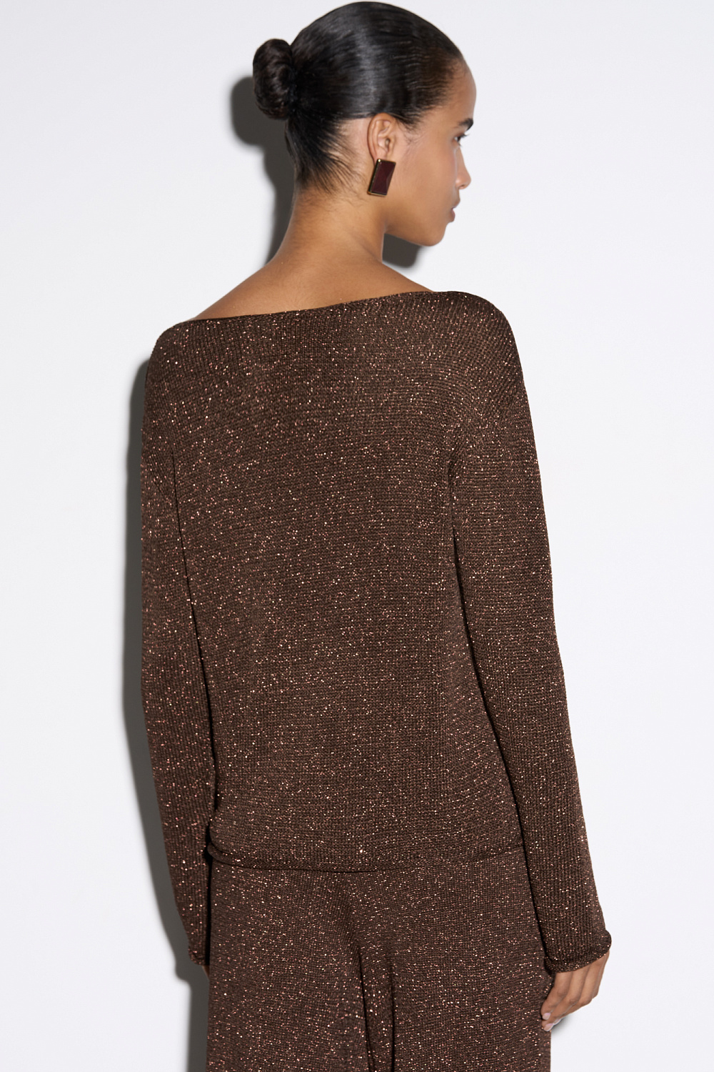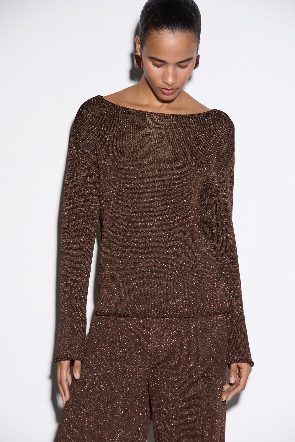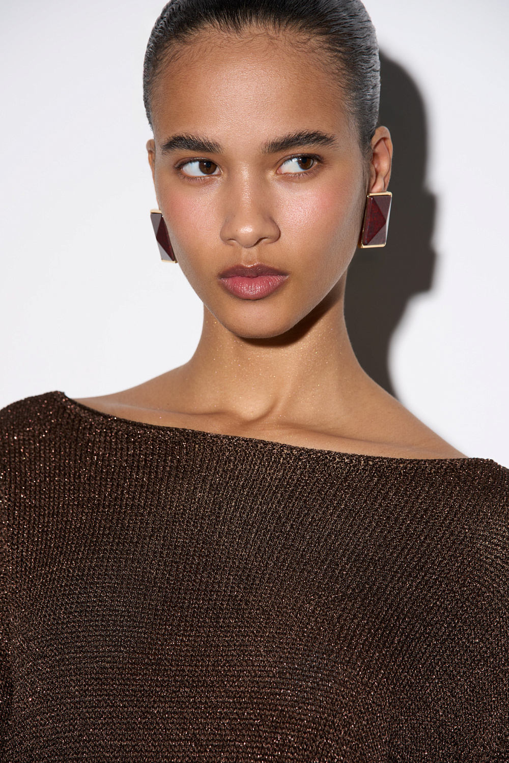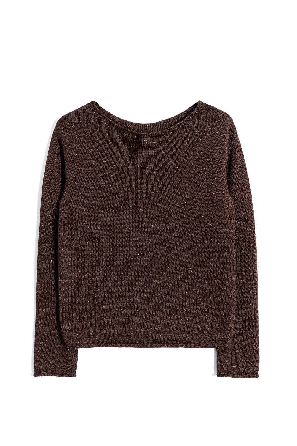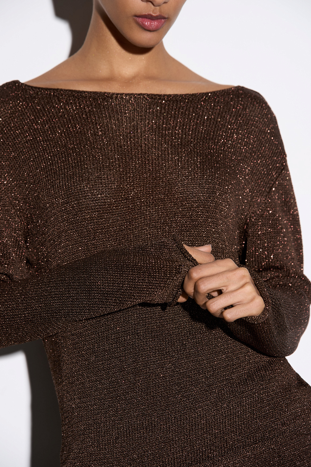 Longsleeve made of viscose with lurex. Model with a boat neckline and long sleeves. The cuffs of the sleeves and the bottom of the product are decorated with bolsters.