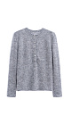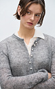 Knitted long-sleeve made of kidmohair, decorated with small sequins. Model with a round neckline with a button placket. The edges of the product are decorated with a roller.