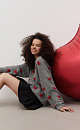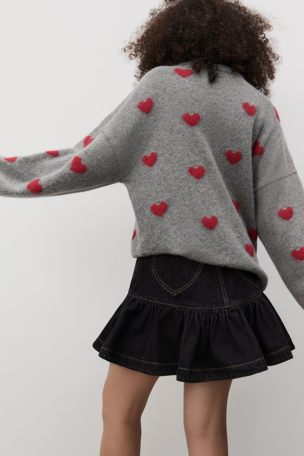 Jumper made of wool and fox down with a jacquard heart pattern. Loose silhouette model with dropped shoulders and a round neckline. The cuffs of the sleeves and the hem of the item are made in chic rib with slits in a grunge style.