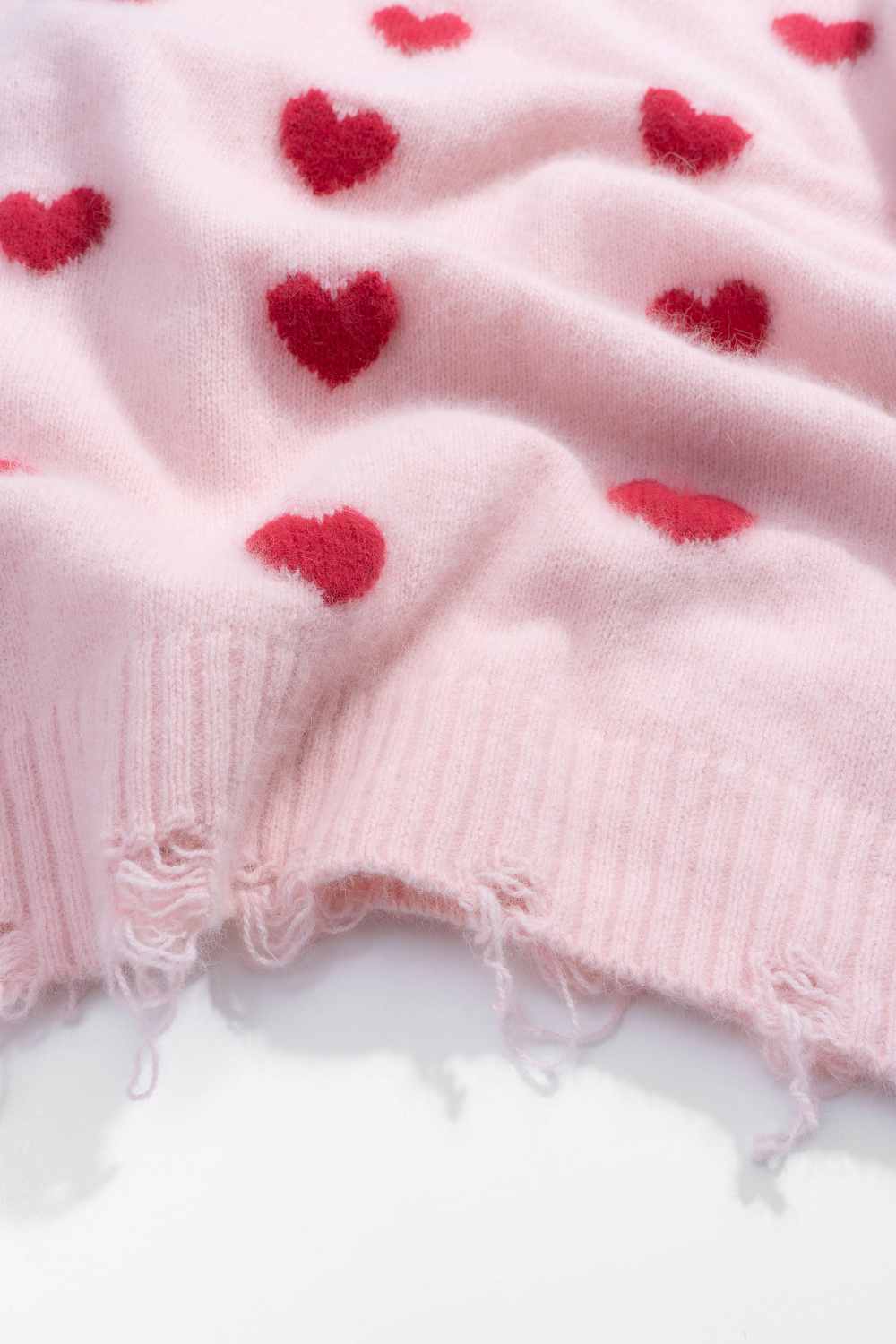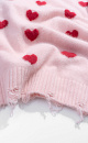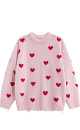 Jumper made of wool and fox down with a jacquard heart pattern. Loose silhouette model with dropped shoulders and a round neckline. The cuffs of the sleeves and the hem of the item are made in chic rib with slits in a grunge style.