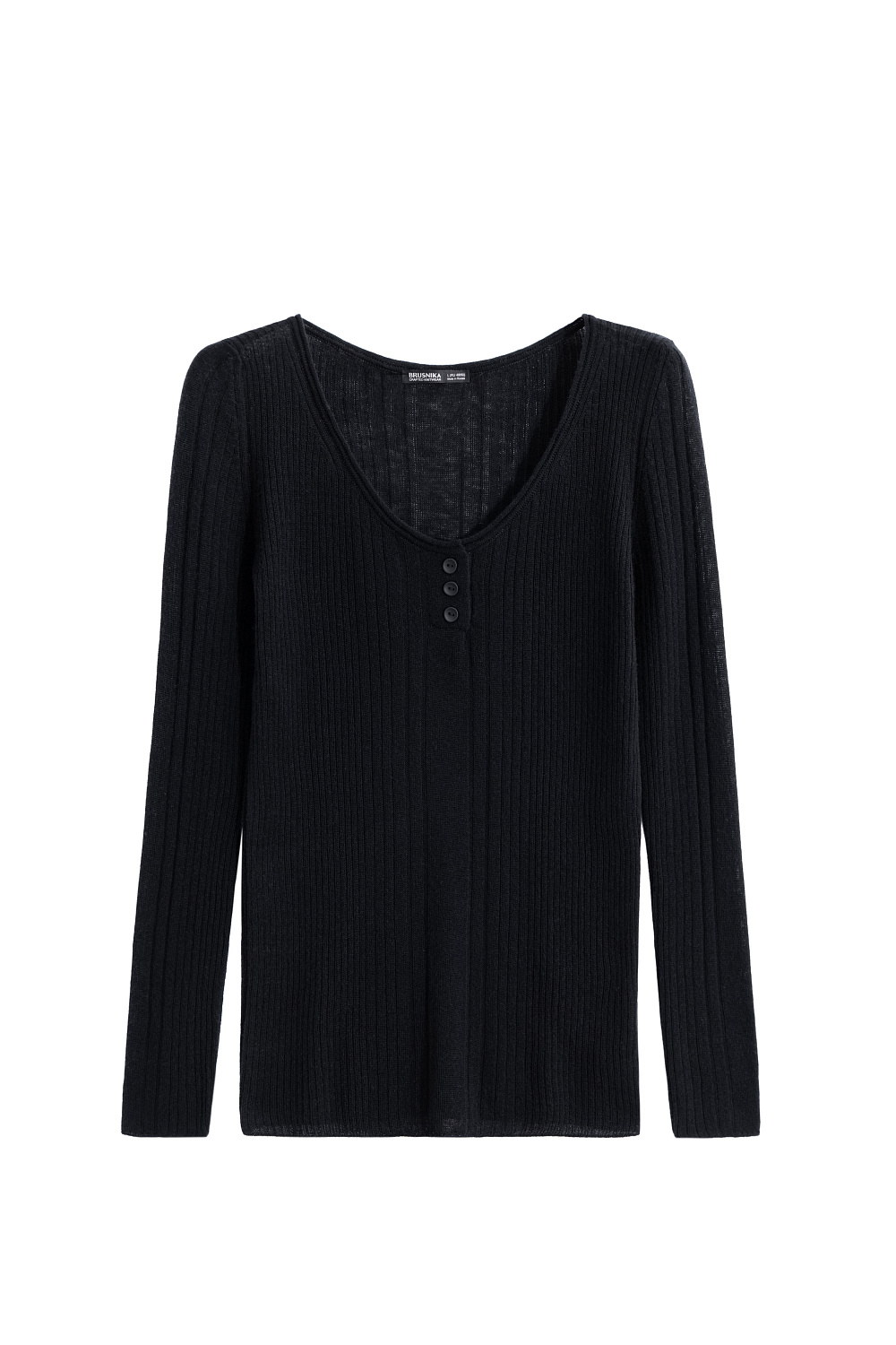 Knitted long sleeve extrafine merino wool. Model with a deep neckline with buttons.