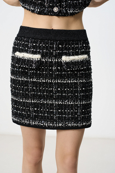 Knitted long jumper made of viscose with lurex. Loose silhouette model with dropped shoulders and a round neckline. The edges of the product are ribbed.