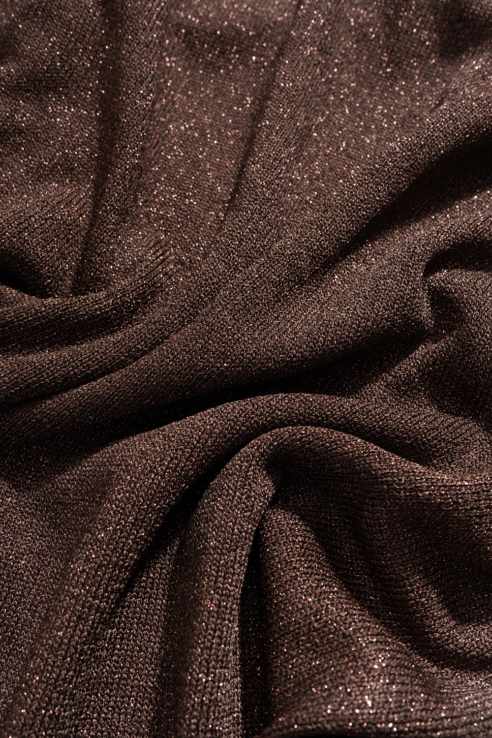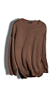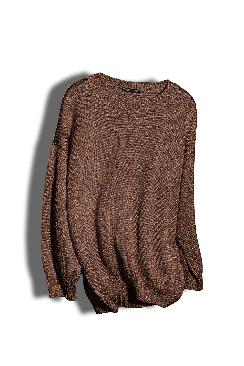 Knitted long jumper made of viscose with lurex. Loose silhouette model with dropped shoulders and a round neckline. The edges of the product are ribbed.