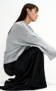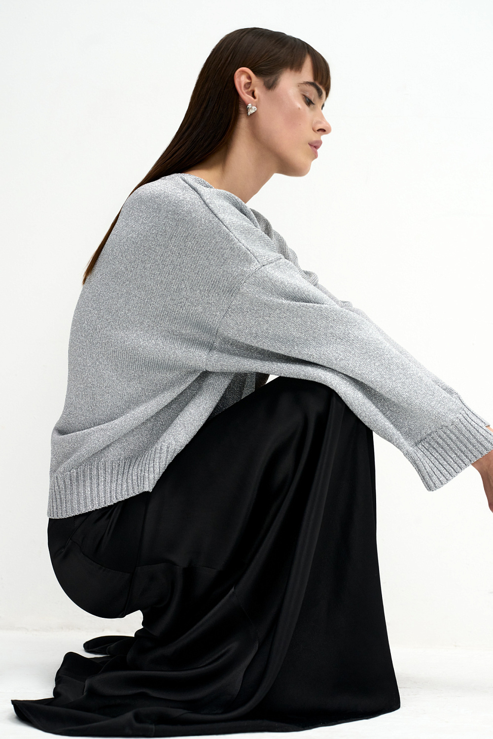 Knitted jumper in a loose silhouette with dropped shoulders and a round neckline, decorated with rib along the edges. The product is made of material with a metallic shine effect.